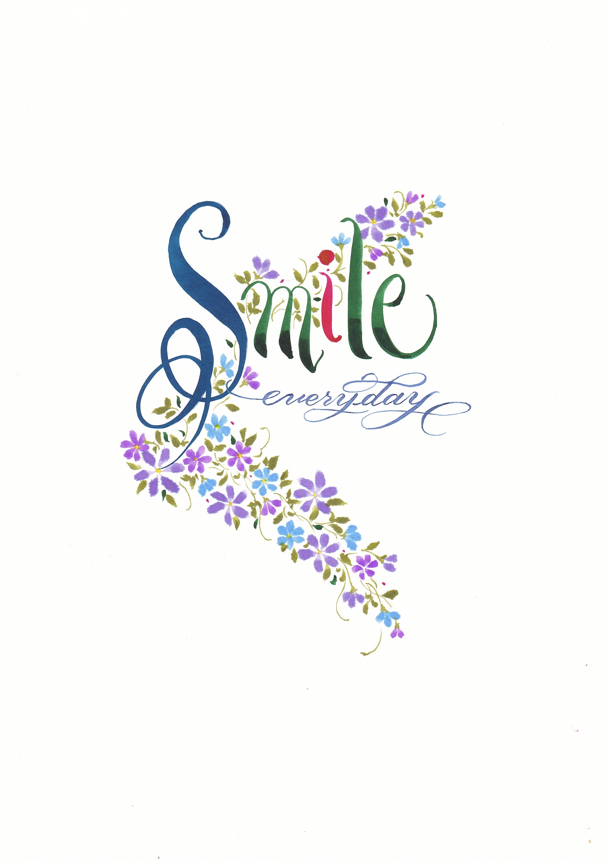 花の中に書いたsmileの文字は筆文字で。everydayは筆から色を出して水を加えてペン先につけて書いています。毎日ちょっぴり笑顔になったことや楽しい事、嬉しかった事を書けたらいいですね^ ^