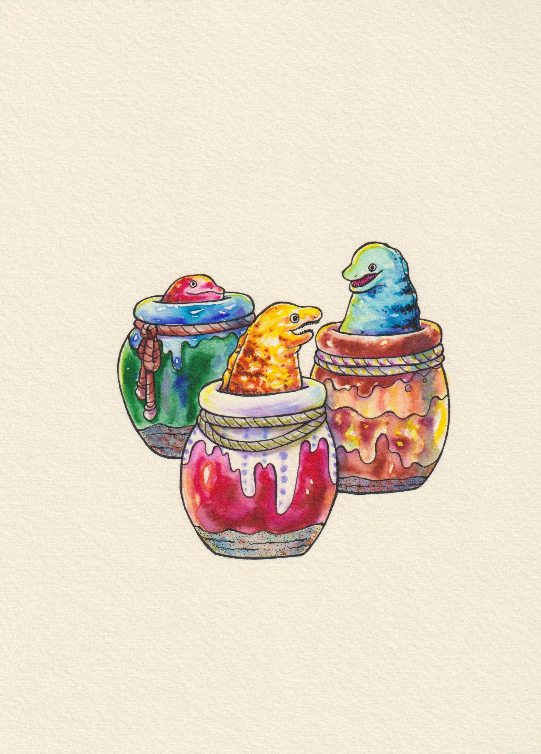「ツボからウツボ」という語感が面白いなぁ、と思い描いてみました。水族館でみかけると、なんとなく何か物言いたげに見えてくるウツボさんたち。この子たちは一体どんなおはなしをしているのか、想像しながら楽しんでいただけますと幸いです。