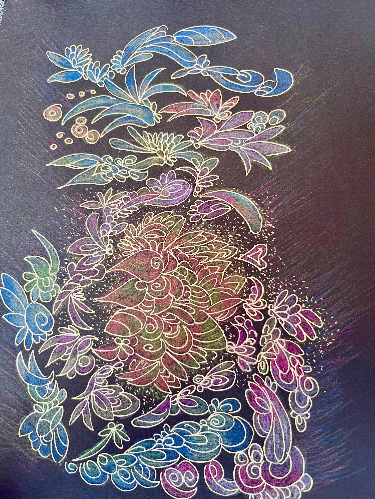 新しくどんどん生まれていく隠されていた才能が表に出る金色のペンと色鉛筆で表現しています。描く時は思考はいれず、手の動くままに描いています