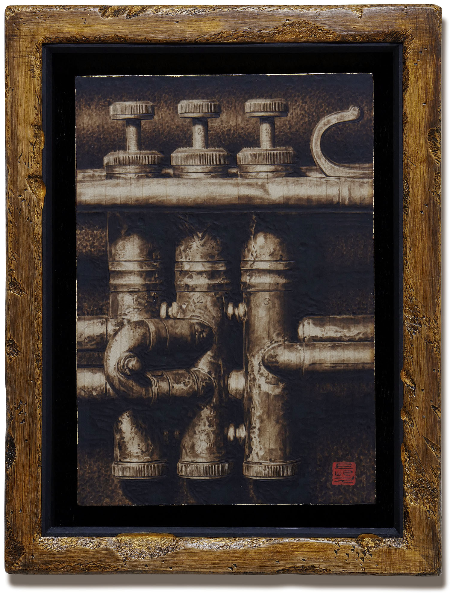 焼き絵(ウッドバーニング)技法で制作しています。額縁も自作です。