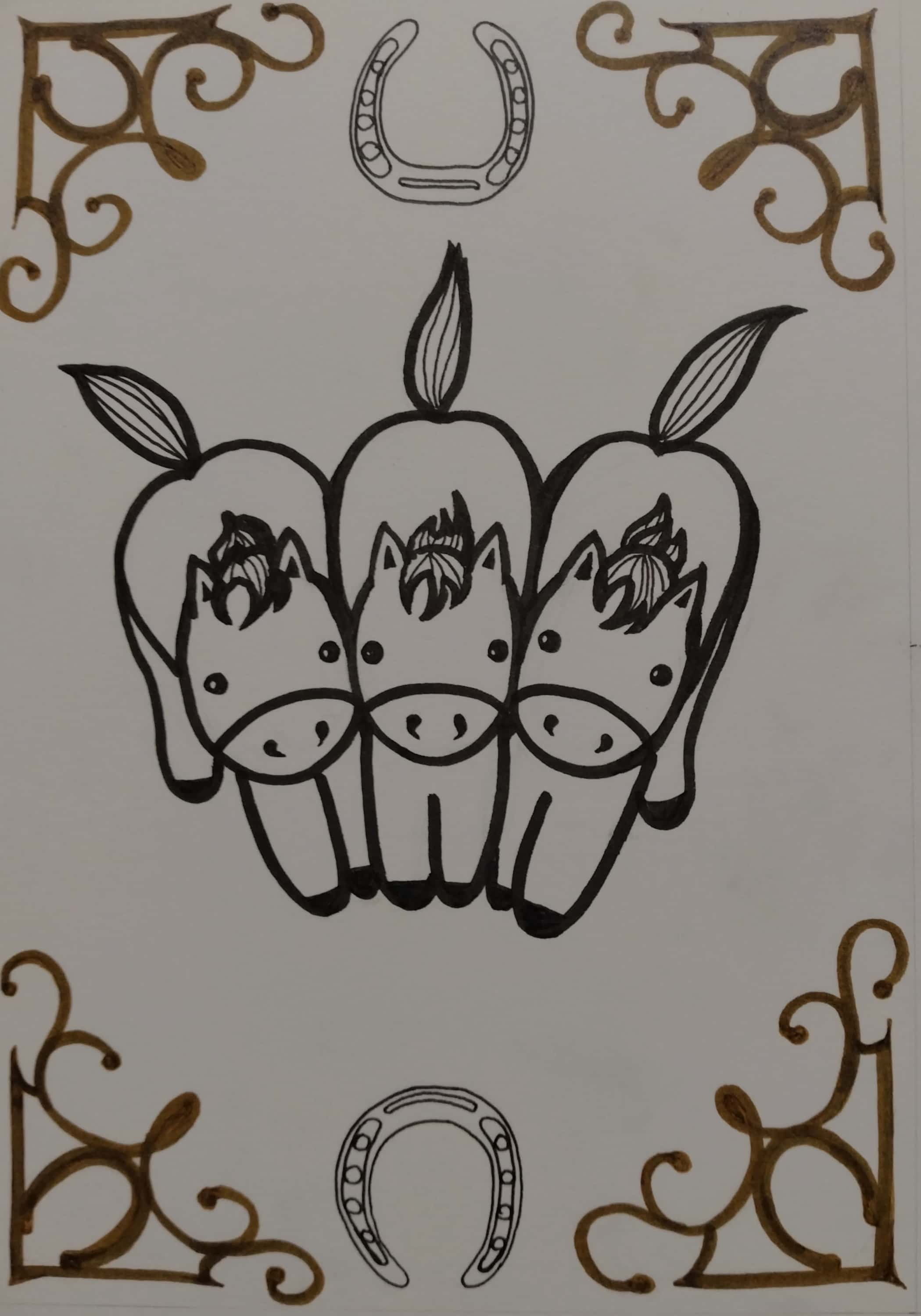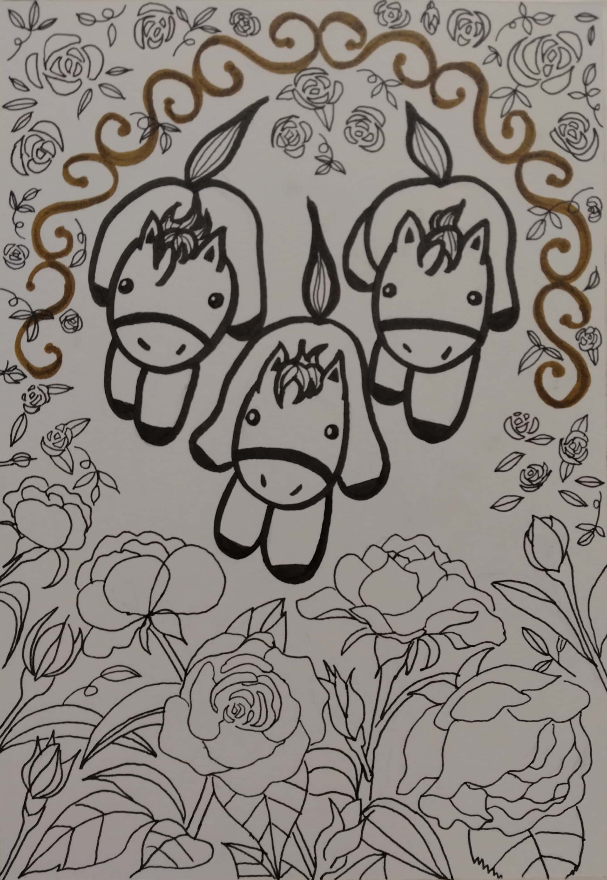 仲良く遊ぶ仔馬を描きました。表紙は薔薇園で走り回り、裏はギューッと体を寄せ合う様子です。