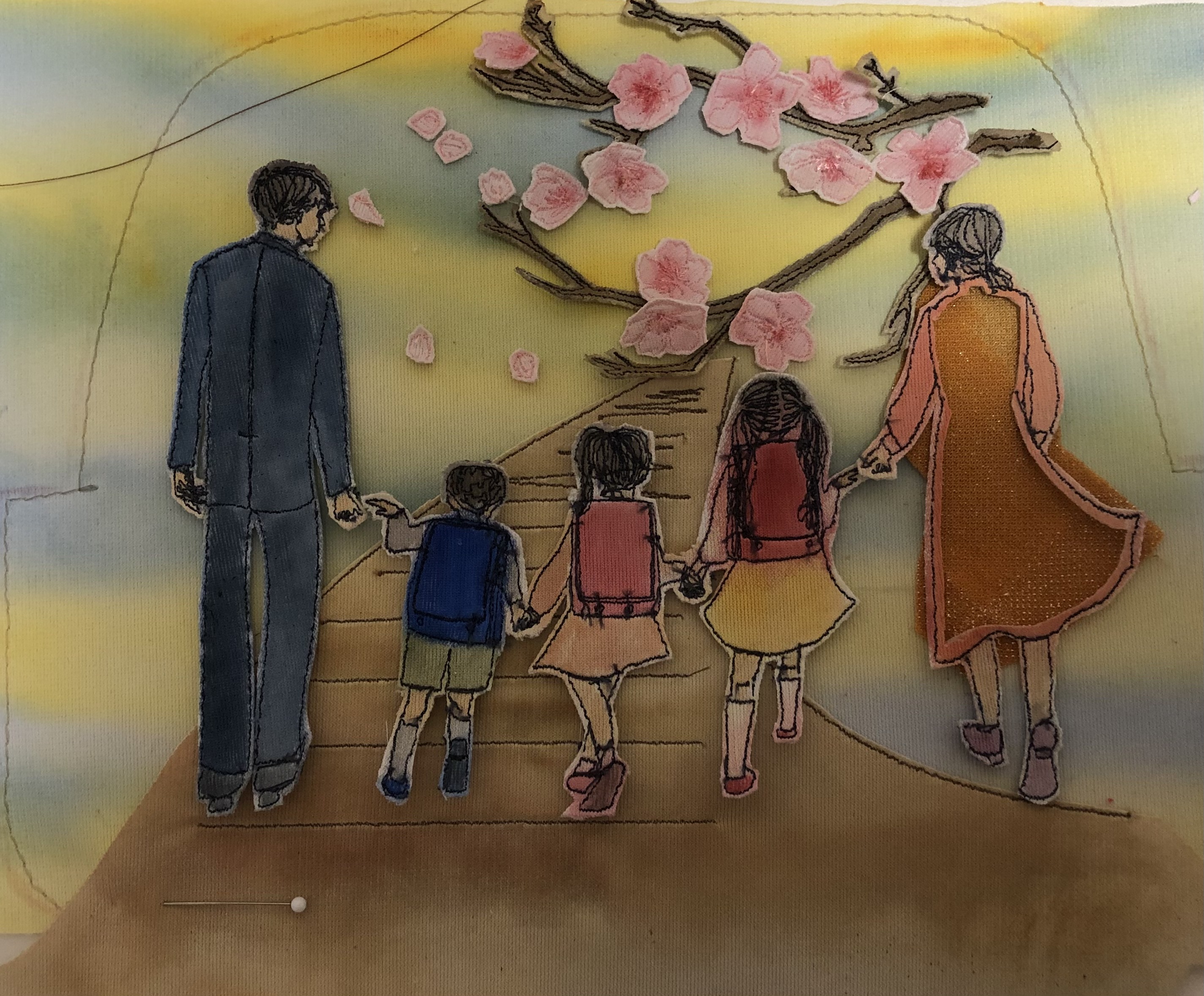 https://note.com/bijoublanc/n/n8a3a009fb82a思い出の図案を刺繍して、思い出の布のアップリケや布用絵の具で着彩しました。