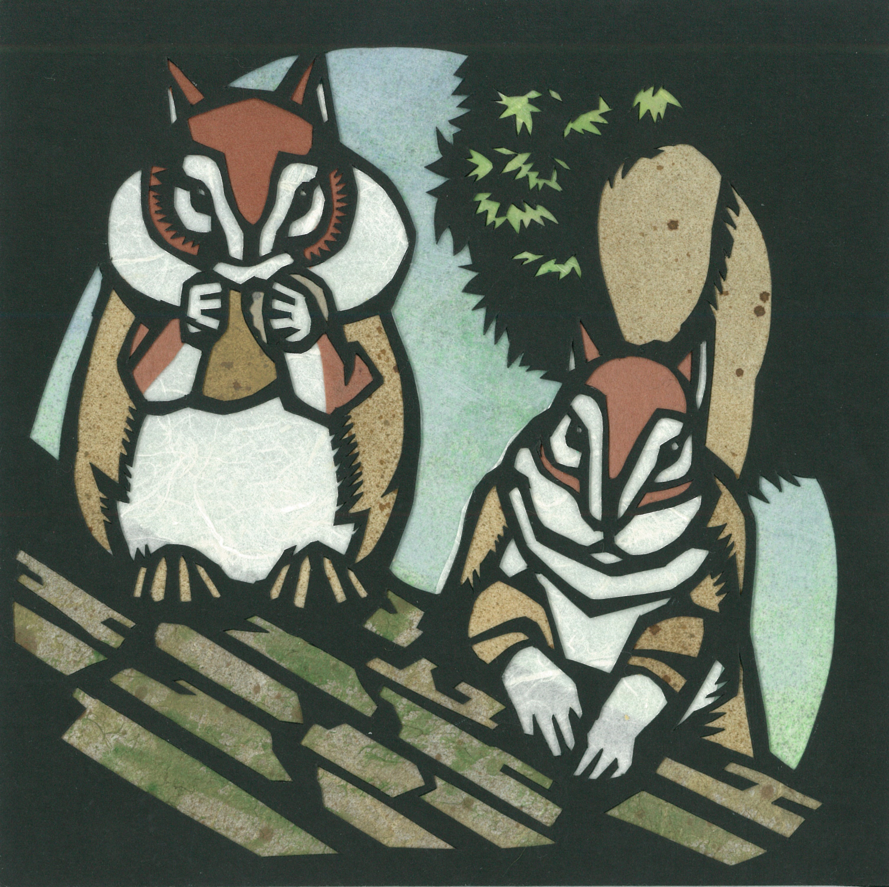 森に棲む、家族のリスの切り絵です。兄妹助け合い、強く生きています。