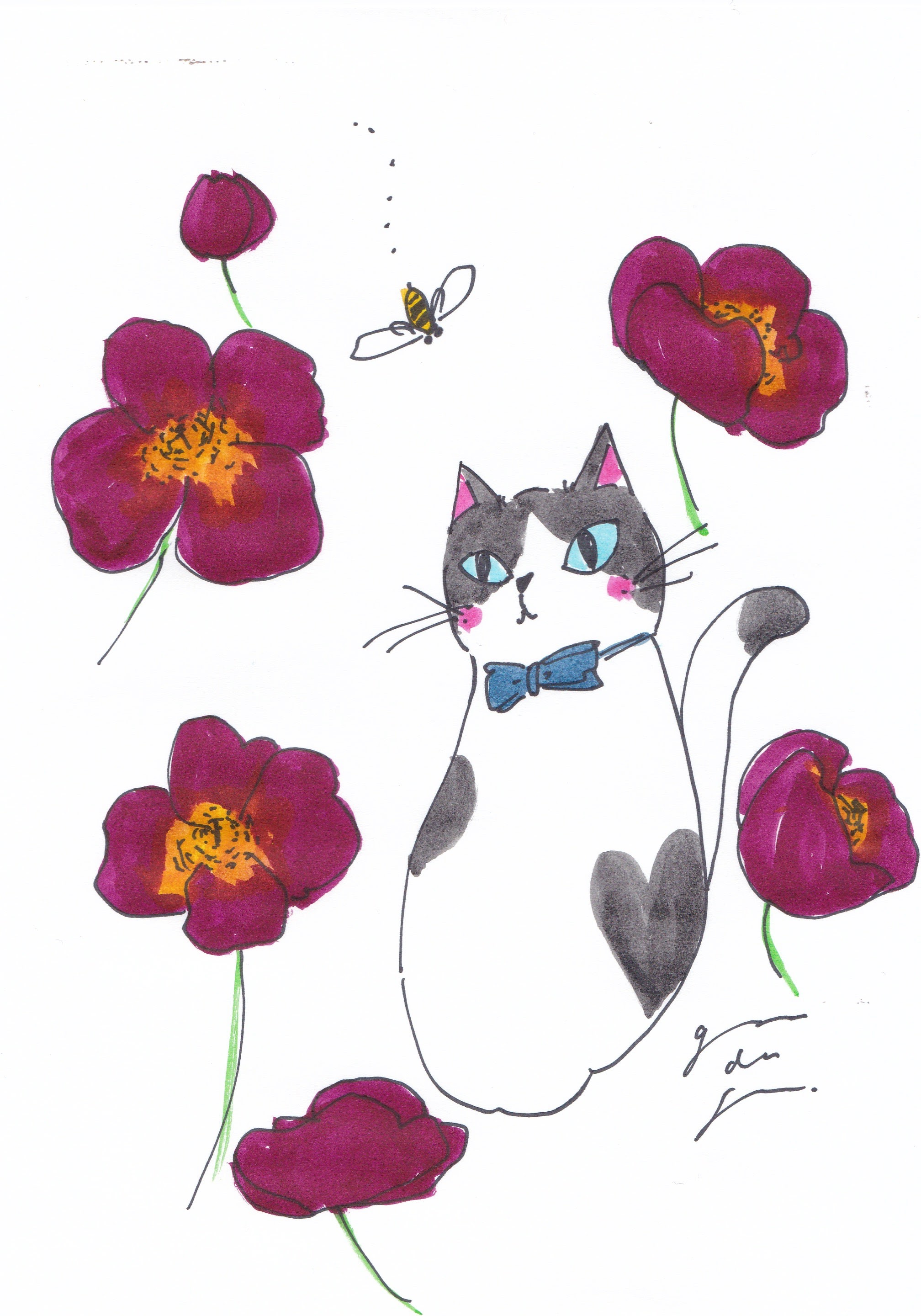 ハチワレ猫がぼんやりしてるといつのまにかお花とみつばちが寄り添ってくれてる。ほっこりする時間。