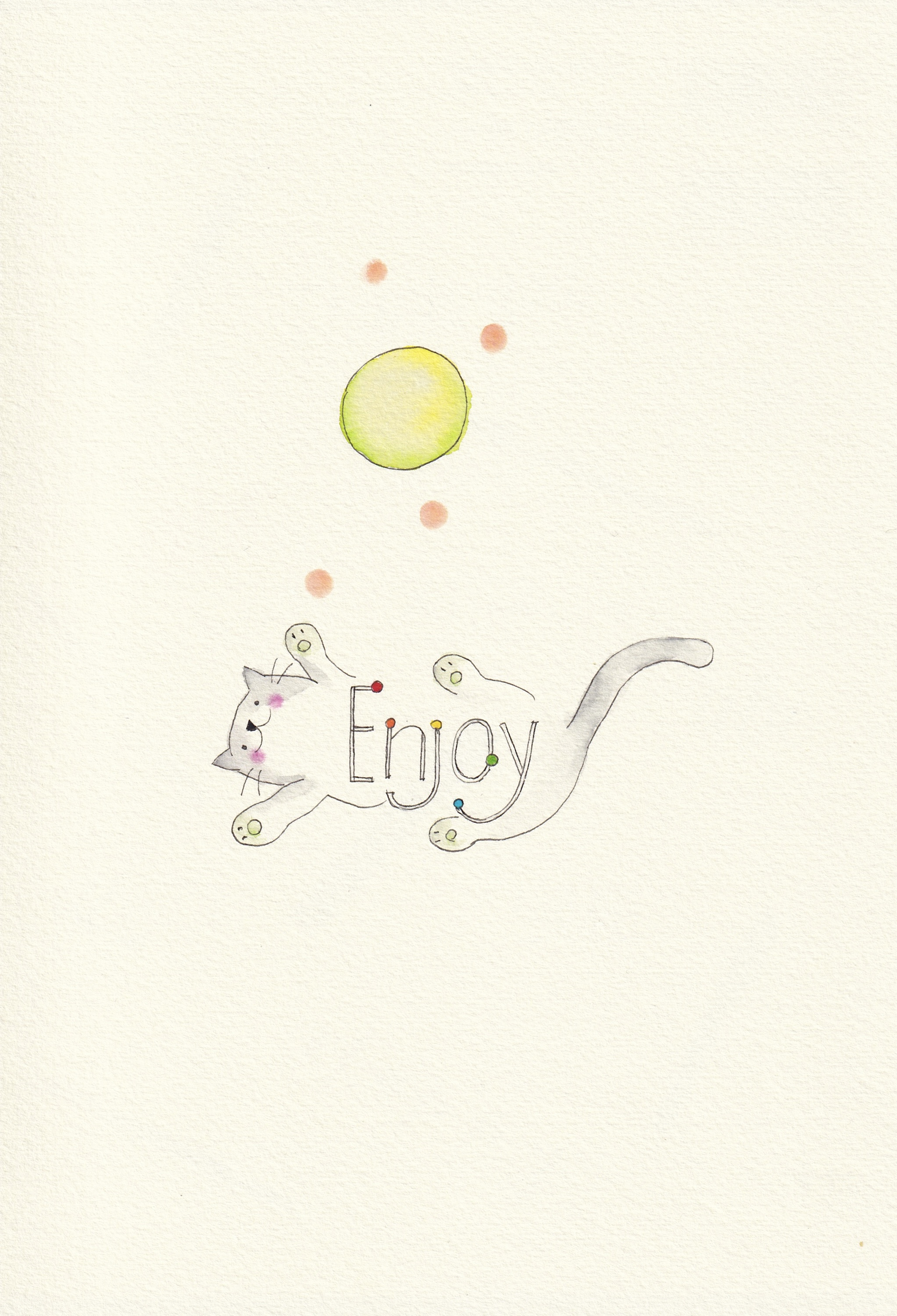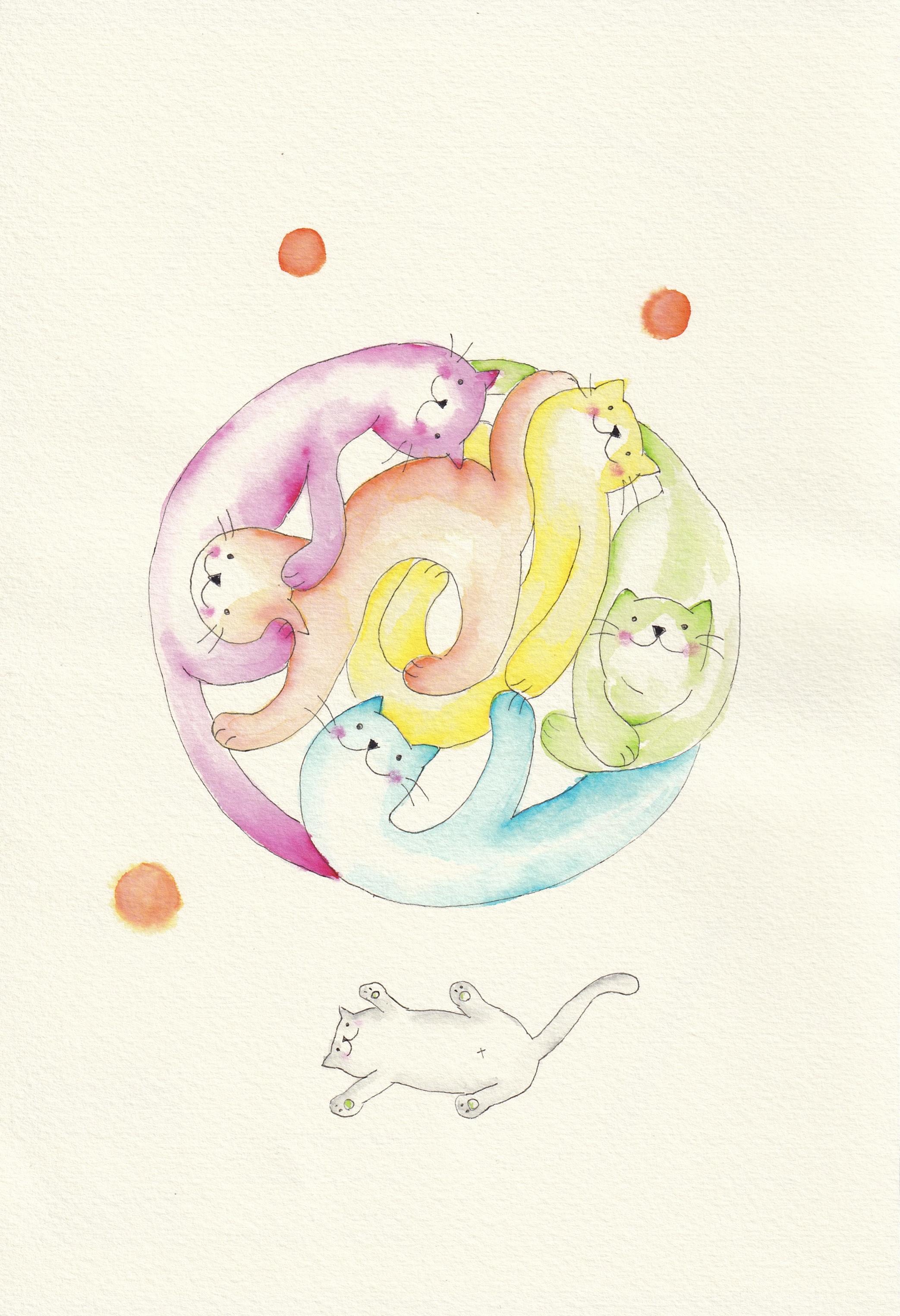 「楽しもうねっ」という気持ちをこめて、表紙には猫たちの絵文字で、裏表紙にはダイレクトに文字を入れつつ、絵も色もホンワカな感じに描いています。