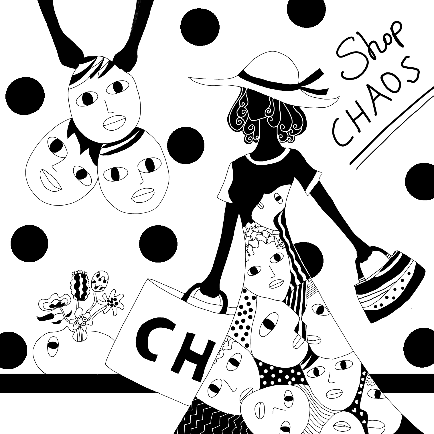 CHAOSブランドで買った服を着て、ご機嫌でお店の前を歩く女性。本当にこんな服があったら、買うのにも着るのにも勇気が入りますが、イラストならオシャレな感じになりました。