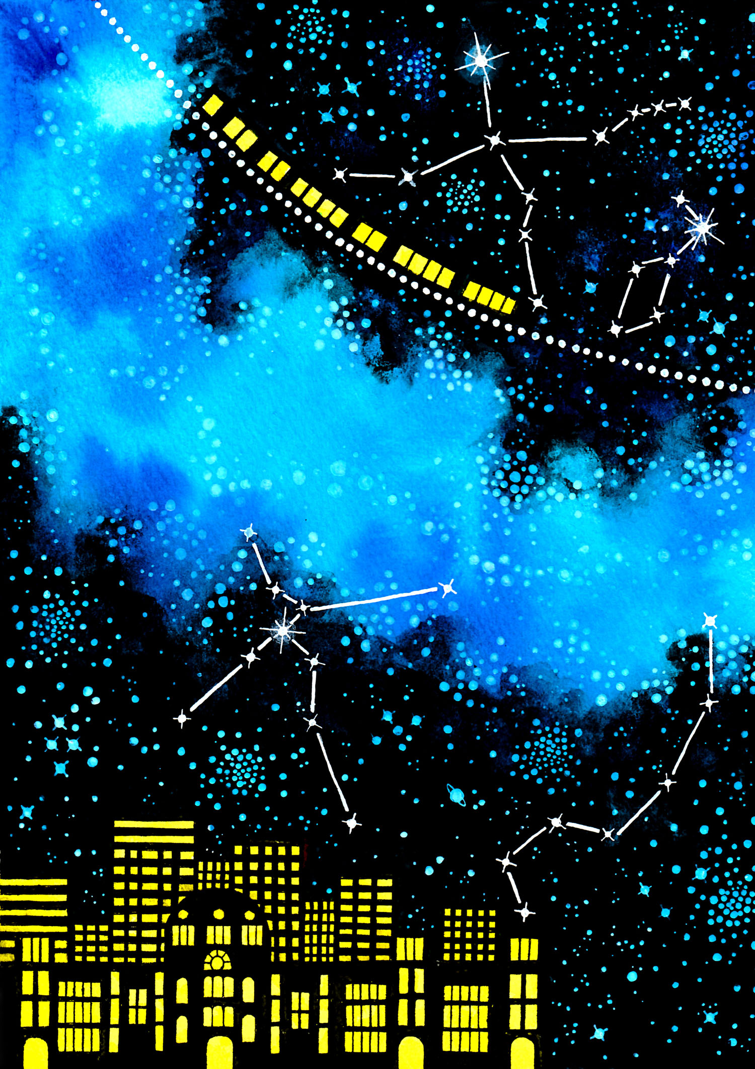 宇宙には行ったことはないけれど、人は空を見て想像することができる。それがいつか希望になり夢になる。星の海を泳ぐジンベエザメ、空を走る列車。空を見て想うことを絵にしました。