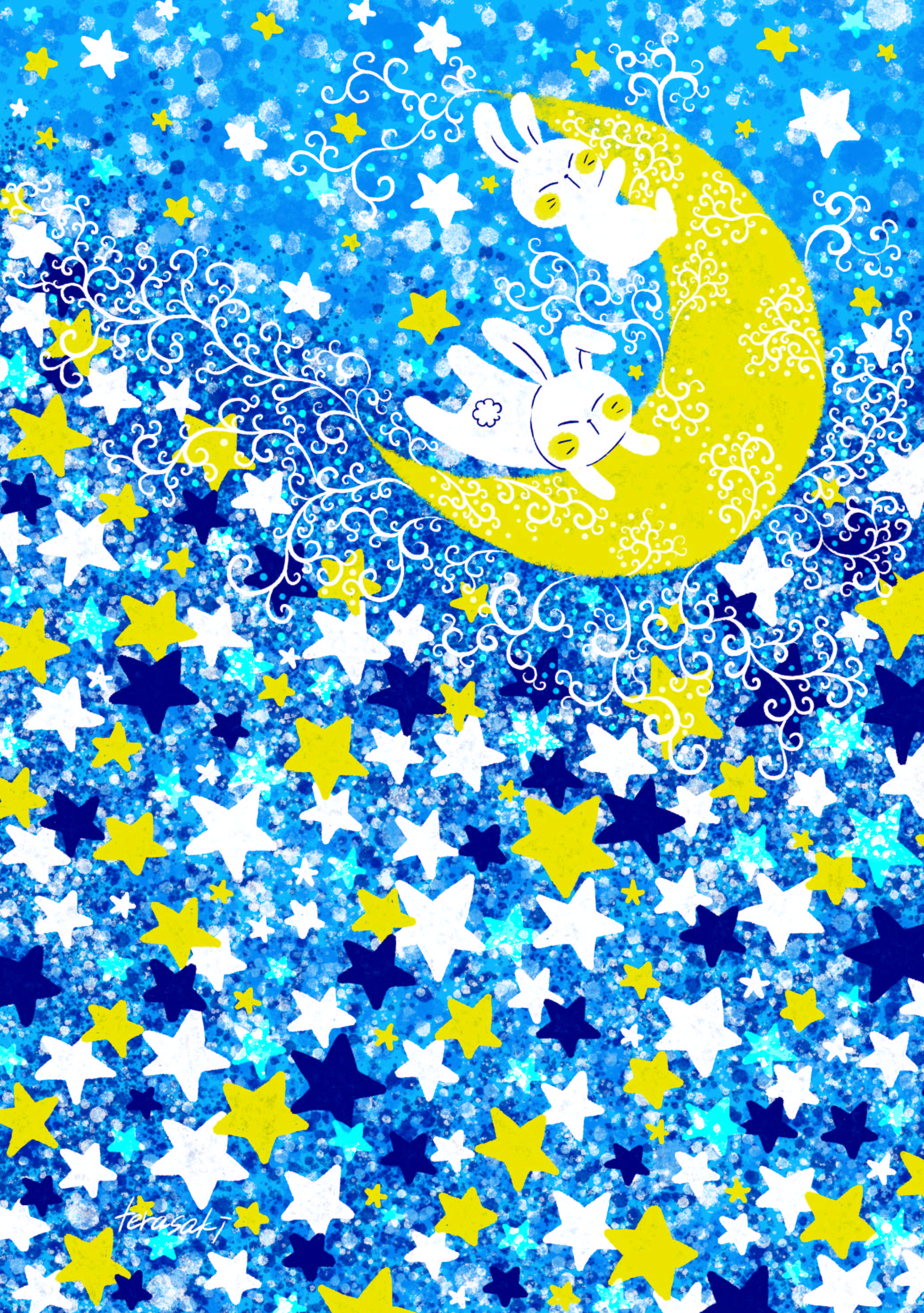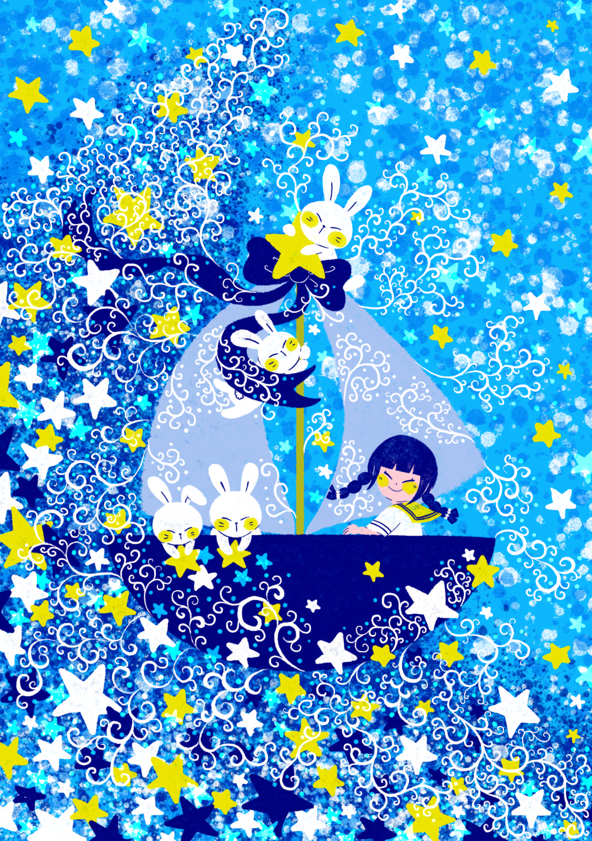 公募テーマの『universum(宇宙)』から【宇宙の旅】をイメージして、女の子とうさぎが船できらめく星の中を旅をしている様子を描きました。紺、水色、黄色、白を使い、すっきりと爽やかな宇宙に仕上げました。表と裏で一枚の絵にもなっており、大きな星が隠れています。きらめく星の輝きを見に一緒に旅に出かけませんか?