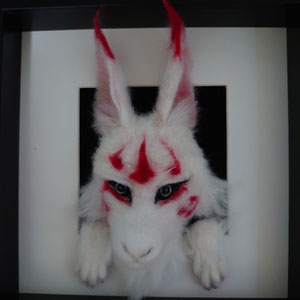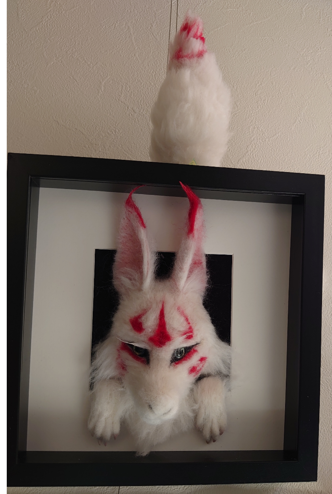 心の闇に悩めるものが鋭い眼光と目があった時1光を感じて闇から一歩前へ進み出してほしい。そんな気持ちを白狐にに込めて造形しました。
