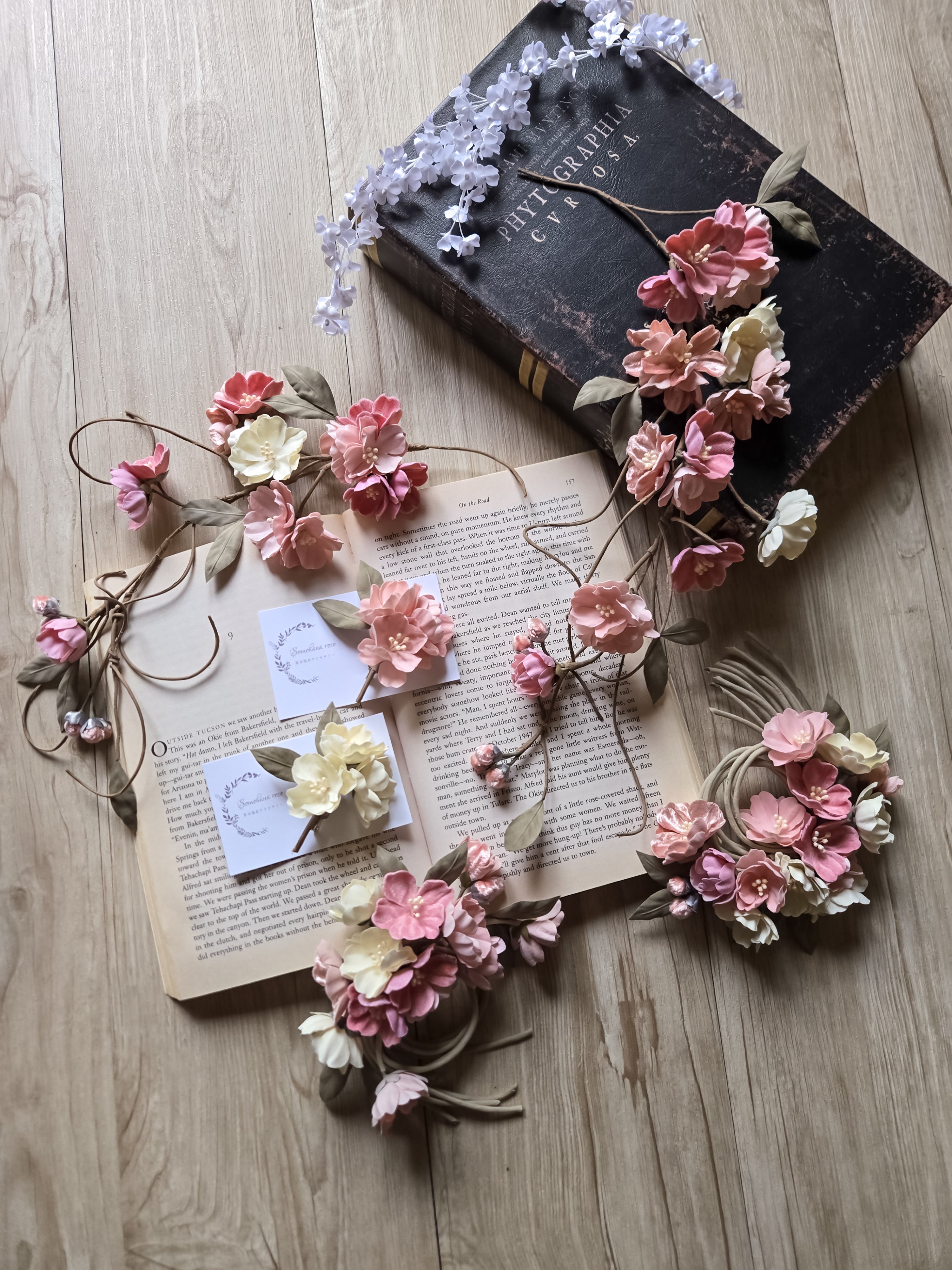 草木染め布花の「桜」ピンク色は茜染め、ホワイトはみかん(皮)染め、茎部分はセンダングサ染め小さなブローチ、コサージュ、インテリアの3種小さなブローチとコサージュはお洋服の胸元やお帽子に。インテリアは棚に置いたり吊るしたりしてお部屋に飾ります。