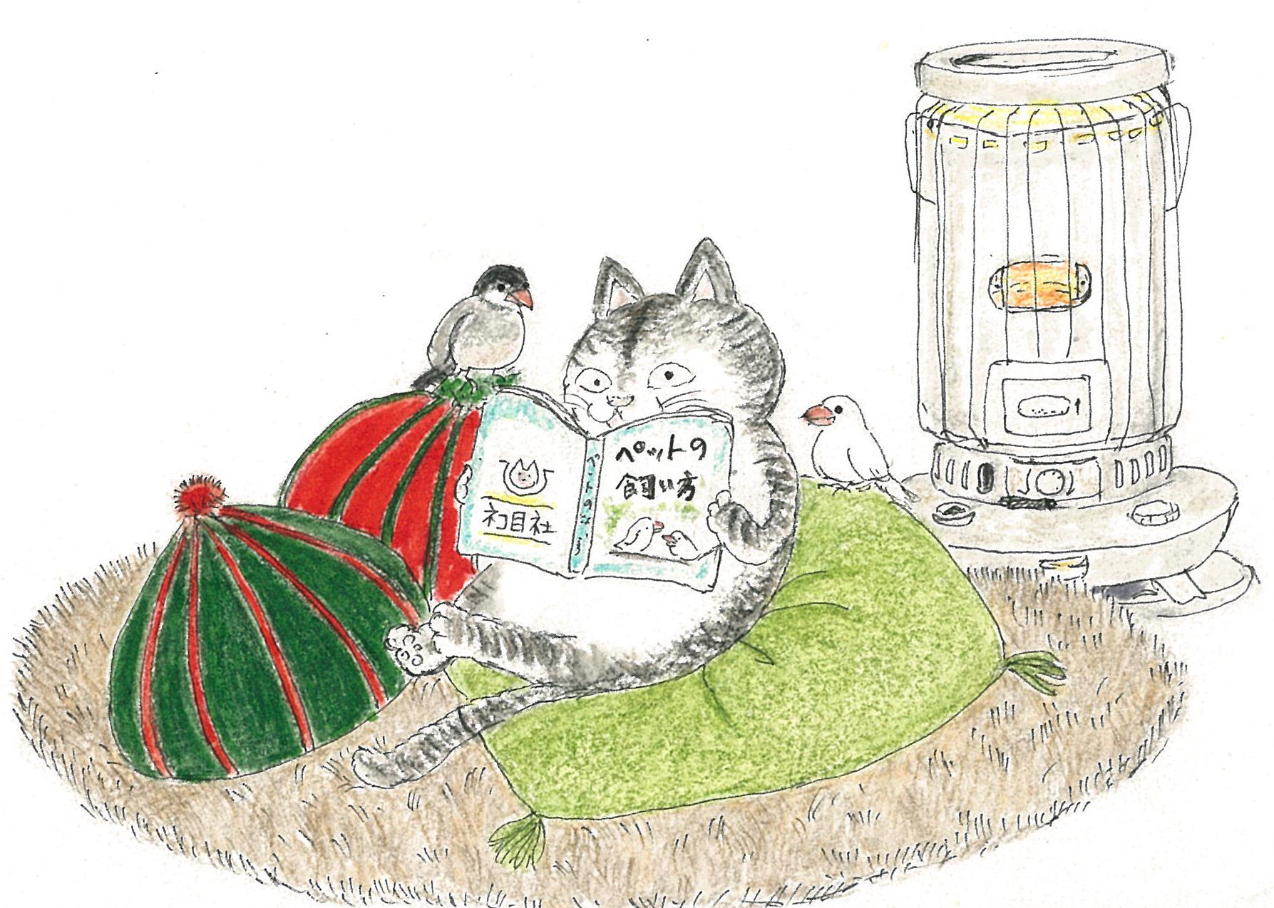 寒い日にストーブの前でぬくぬくしながらネコは、読書中です。どうもペットを飼う様です。自分もペットだと思いますが笑