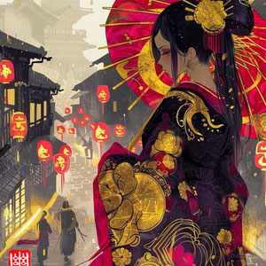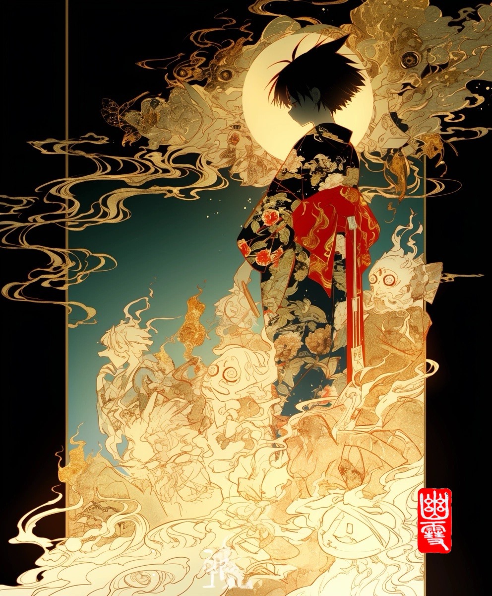 闇夜に浮かぶ一人の影。その背にまとわりつくのは、かつて人であったものか、夢の残骸か。金と墨の狭間に現れる妖たちが、まるで語りかけるように蠢く。AIによる生成に加え、手作業で加筆修正を施すことで、現代と古の幻想が交差する一枚に仕上がった。見る者の心の奥底に潜む”何か”を、そっと呼び覚ます。