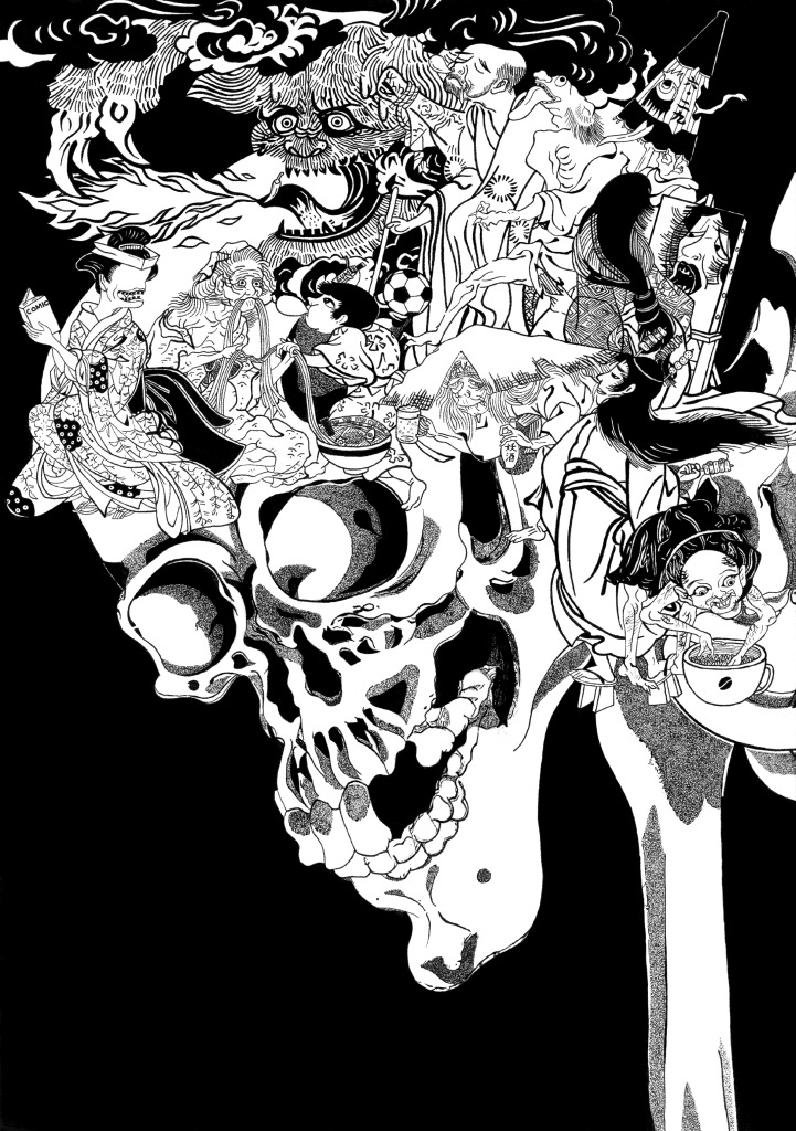 私が好きな妖怪であるがしゃどくろの頭に自分の好きな食べ物や趣味、個性と組み合わさった妖怪たちを詰め込みました。〈使用妖怪と組み合わせ〉・がしゃどくろ・青女房×お絵描き・赤舌×激辛好き・小豆洗い×コーヒー・油赤子×ガム・いそがし×サッカー・丑の刻参り×焼き鳥・海座頭×昼寝好き・白粉婆×酒・お歯黒べったり×漫画・傘化け×梅雨生まれ・古庫裏婆×ラーメン