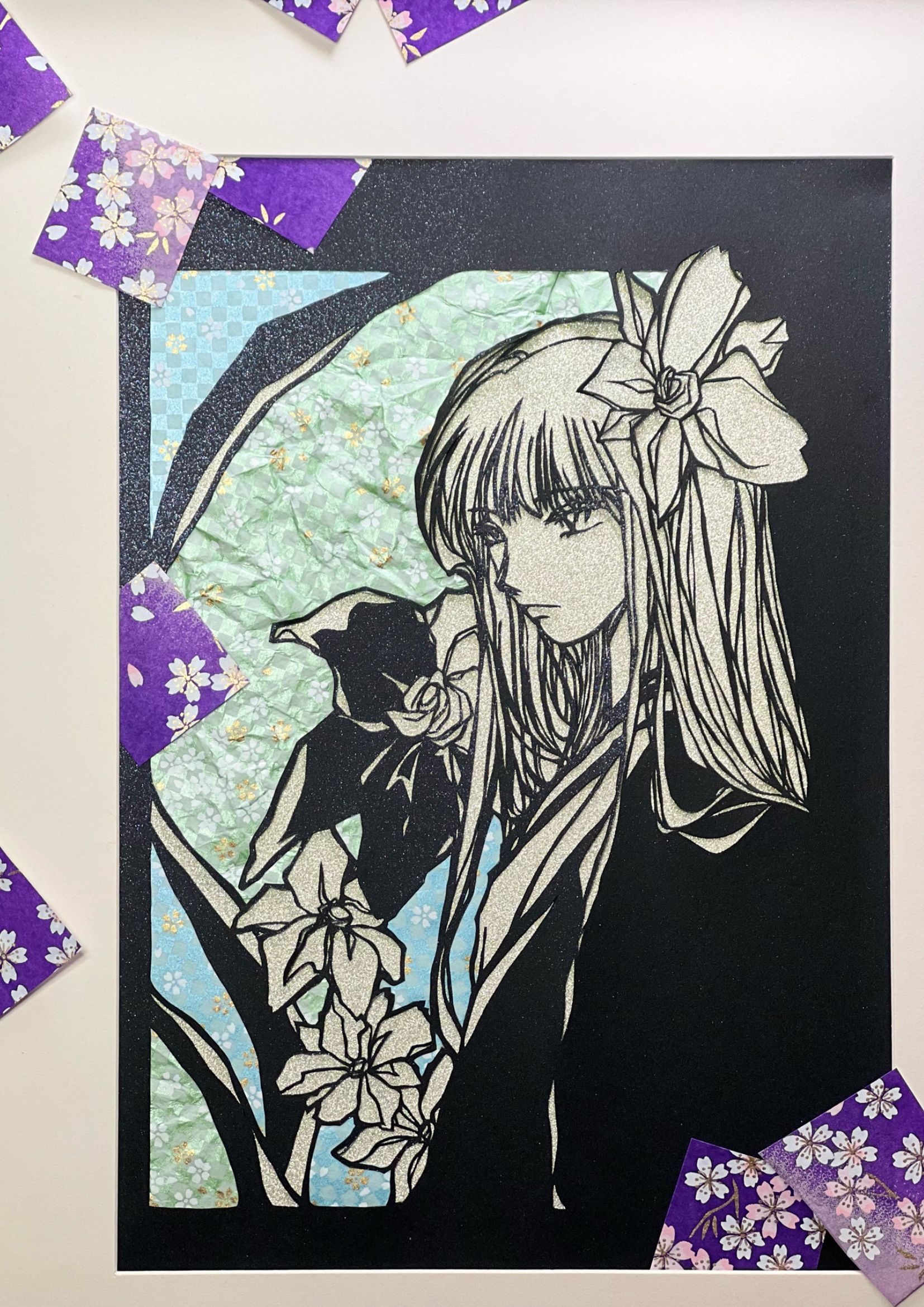 和のイメージの女性の切り絵です。切り絵に和紙を貼り柔らかい感じに仕上げました。図案的には切り絵の黒をはっきりわかるくらいの細かさでカットしました。