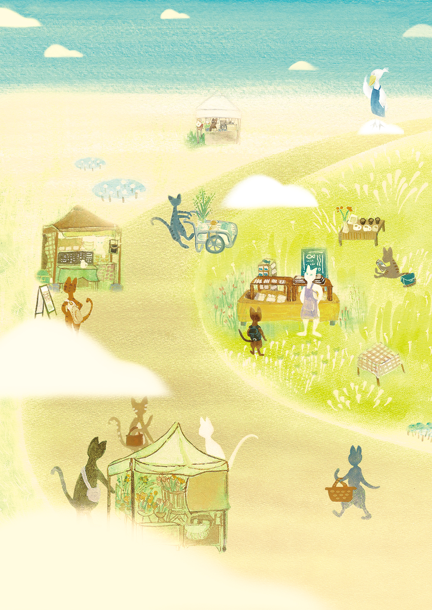 お天気のいい日に開催されたマルシェワクワクしながらいろんな子が集まってくる様子を水彩絵の具で描きました空の上から見ているイメージですどんな掘り出し物が見つかるでしょうか水彩絵の具で描いてからPhotoshopで調整しました