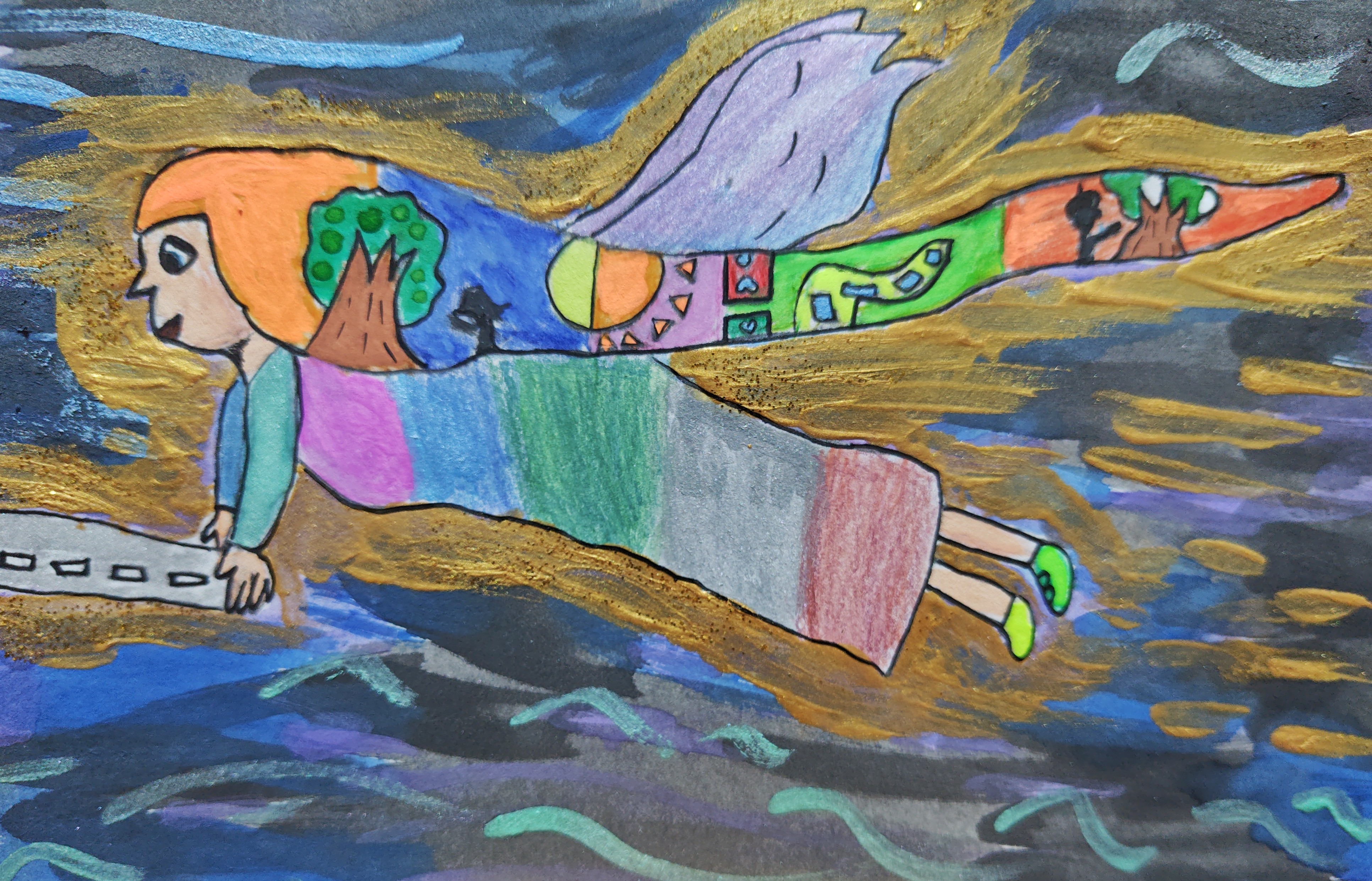 8歳のArtistです。天使手に持っているのは道路天使の髪に木や人影、未来のくねくねビルが描かれています。