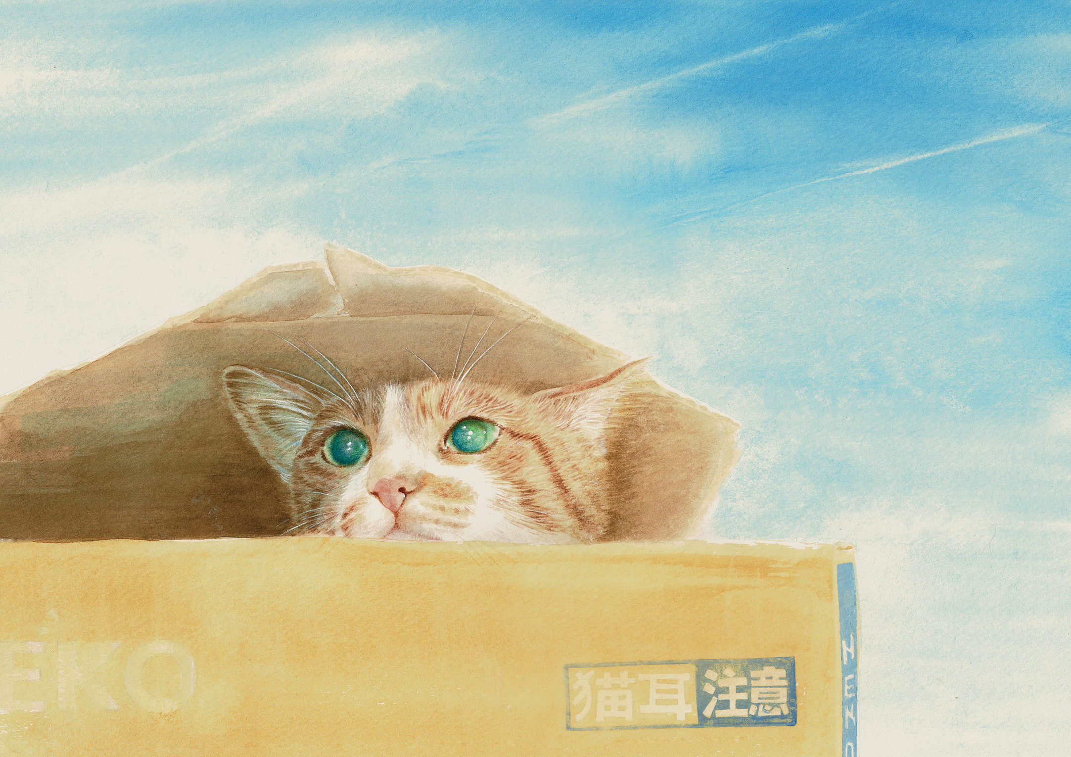 置きっぱなしの段ボールがあるといつの間にかネコが収まっていますオスマシ顔で何を見ているのでしょうか使用した画材は透明水彩です