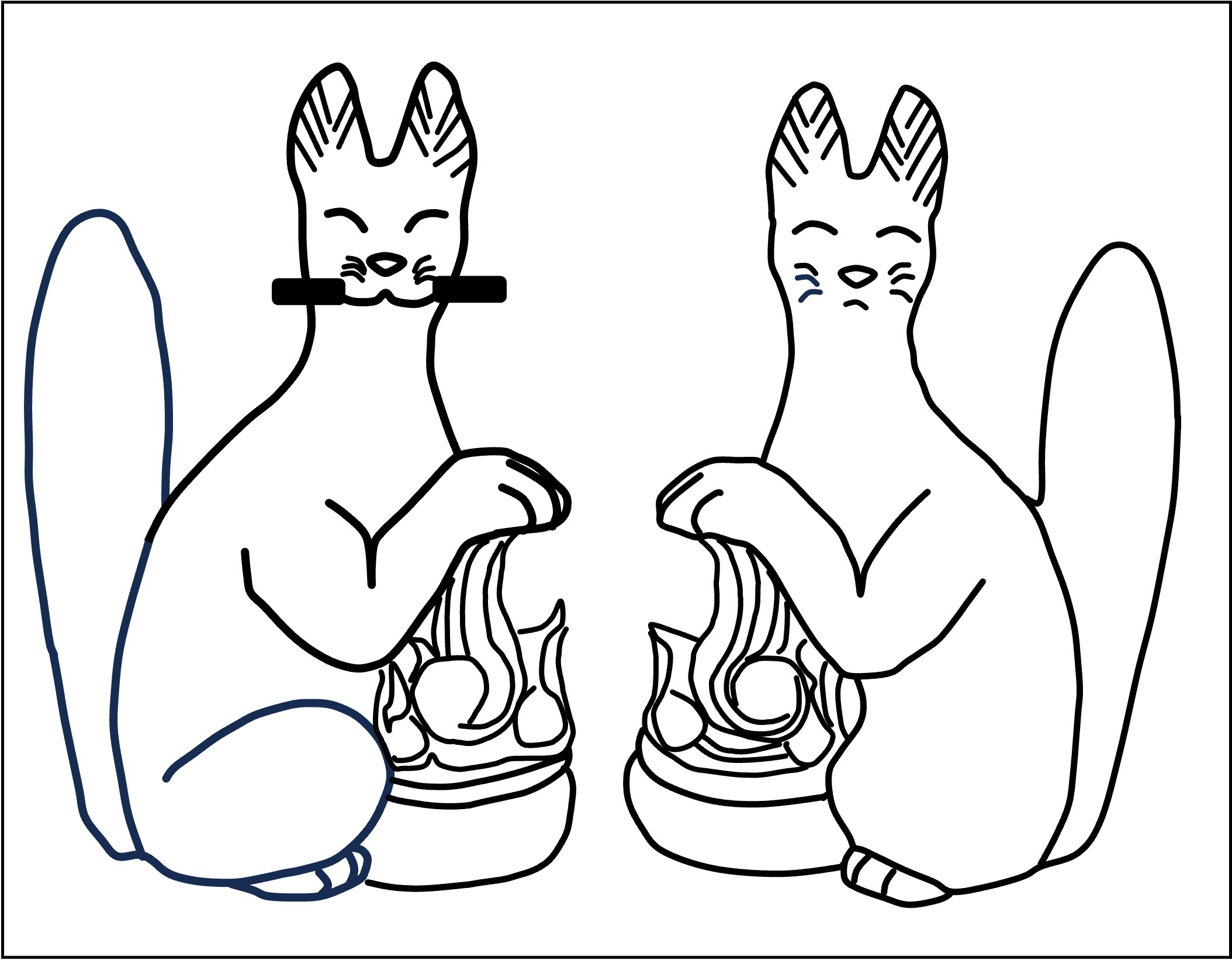 京都と言えば、伏見稲荷神社。眷属の狛狐を描きました。吽の咥えているものは巻物。有名な鍵と迷いましたが、日本全国のお稲荷様で多そうな巻物にしました。阿吽一対の作品。狐、きつね、キツネ