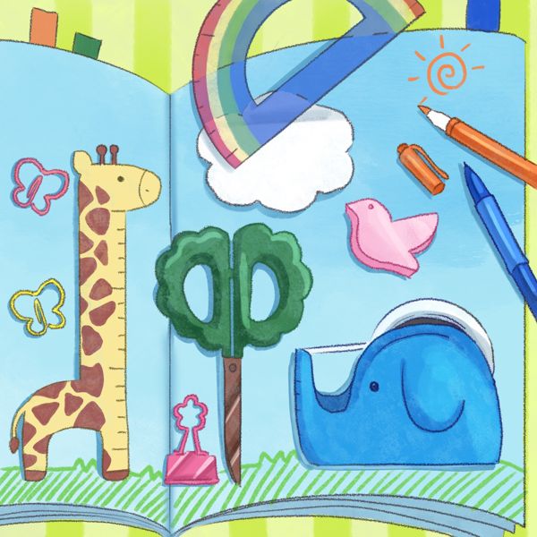 主にノートの上にキリンモチーフの定規や、木をモチーフにしたハサミ、象をモチーフにしたセロテープ、蝶々のクリップ、雲のふせん、虹の文房具を配置しています。