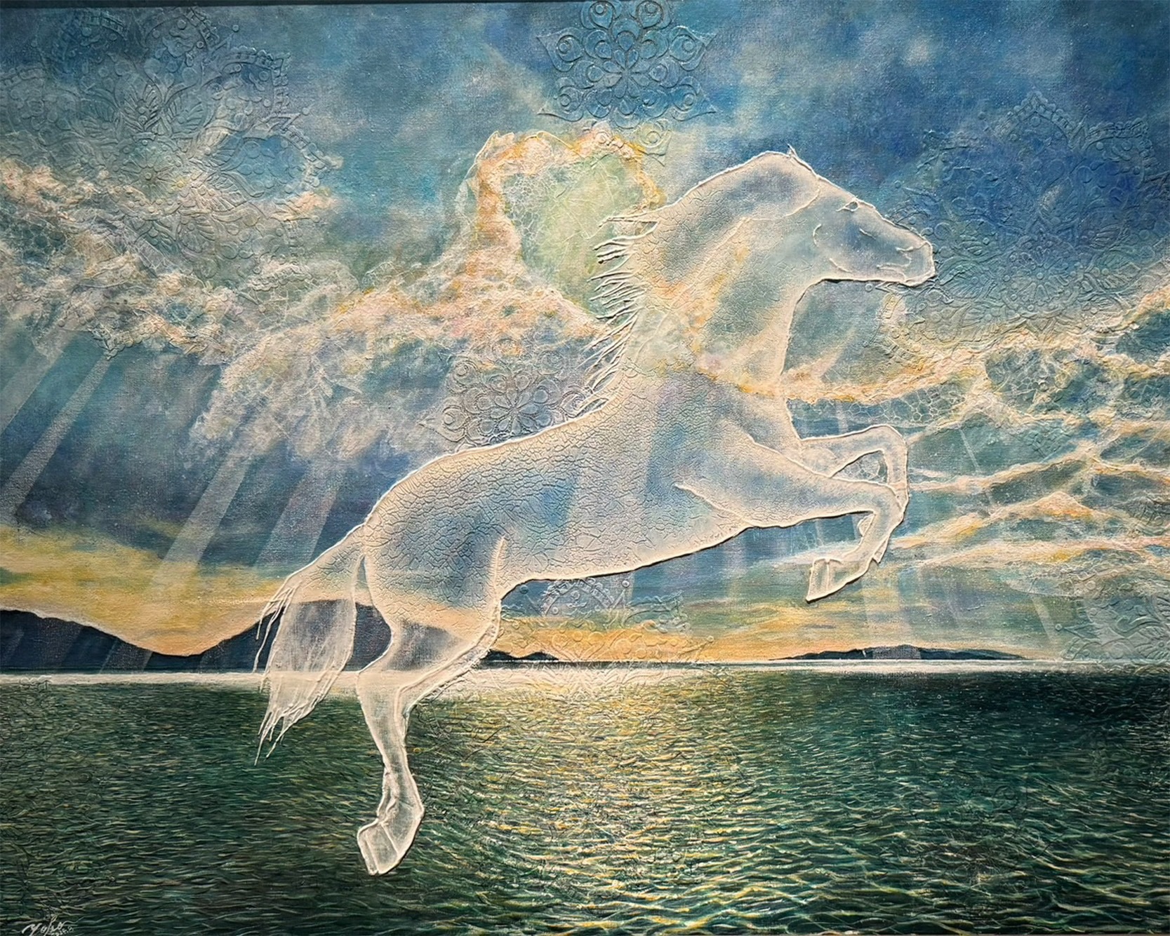 夕日が沈む海辺、雲の間から光りが射す『天使の梯子』からエネルギーが溢れて来て、人に癒しや、力を与える。上昇するエネルギーに例えた『馬』が
