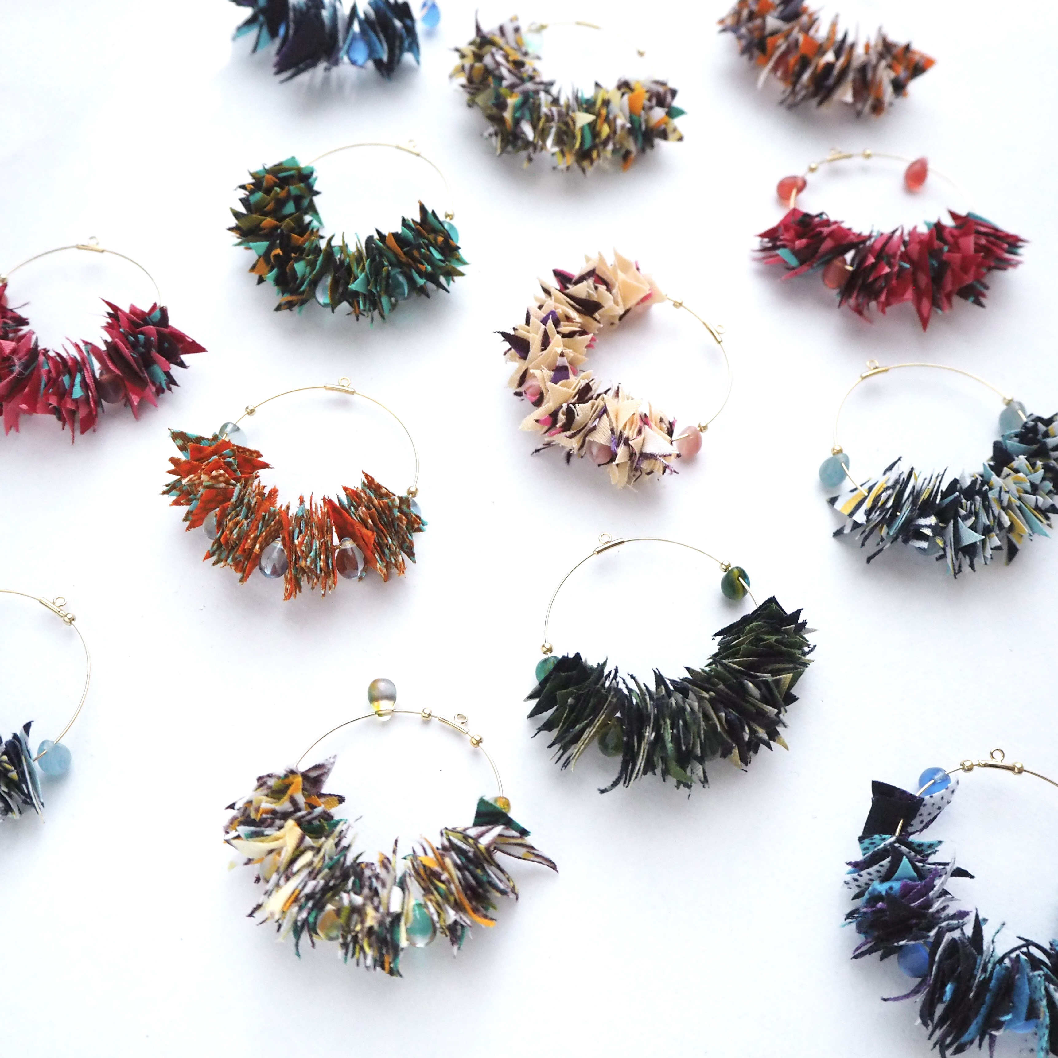 アフリカンプリントを使ったフープの耳飾りです。他の商品を作った際に出るハギレを、捨てることなく最後まで使ったアイテムです。