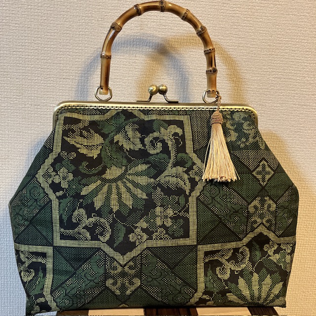 地味な印象の大島紬ですが、堅牢な染、織りで使いやすいがま口バッグにリメイクしました。帯でもがま口バッグは大変軽くて使いやすいと思います。世界に一つしか無い貴方だけのバッグ、ぜひ一度手に取ってご覧ください。