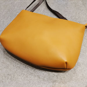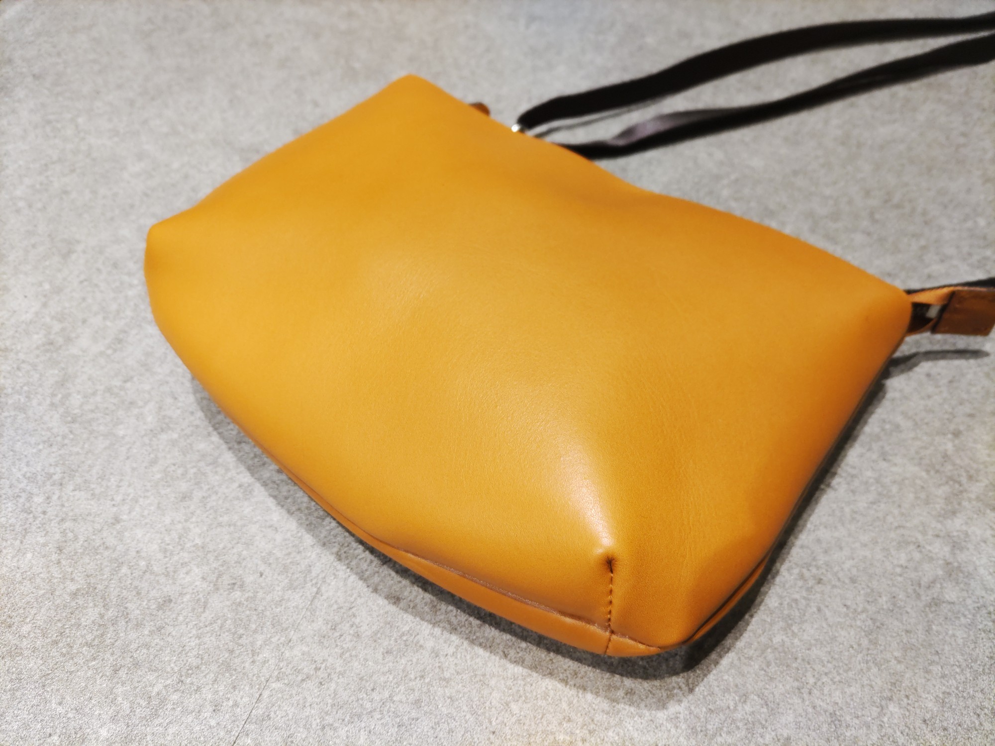 ナッツのようなぷくっとした小型の鞄です。ショルダーテープ付き。口元はファスナー式で内装にフラットポケットとファスナーポケットが付きます。