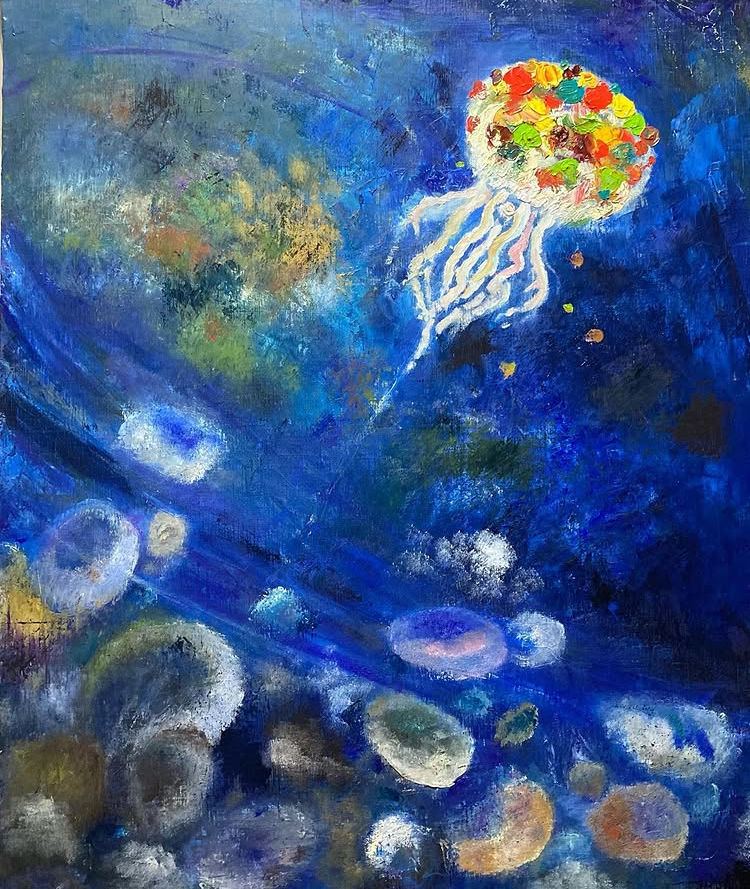 自分から生まれた小さなかけらを集めて誰かに届くまで何度でも送り出す様子を描きました。