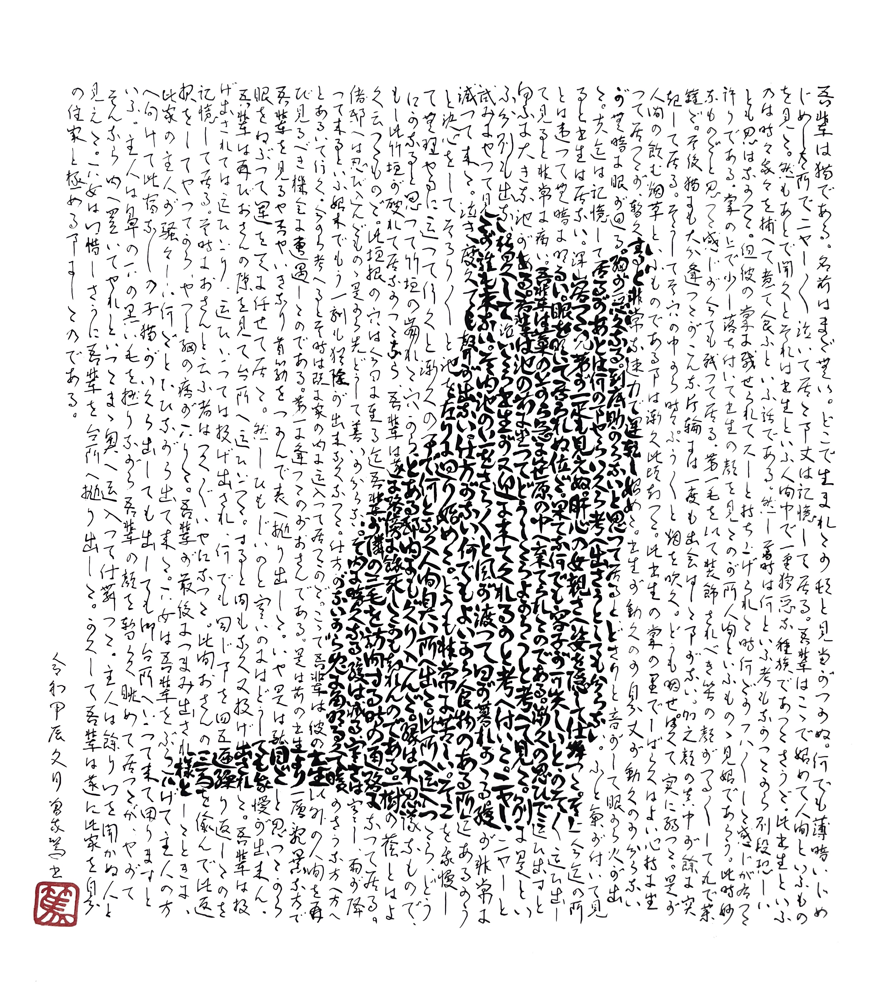 モノトーン クール夏目漱石の代表的な小説『吾輩は猫である』の冒頭部分を手書きしながら、同時に黒猫の姿を描きました。