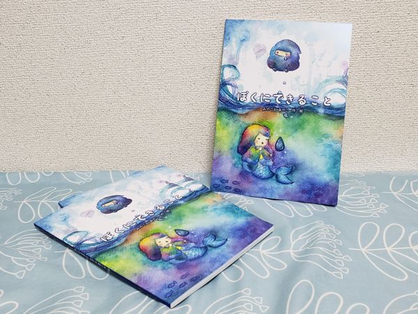 初めて制作させて頂いたオリジナル絵本です。水彩画を中心に描かれています。得意なことが何も無くて落ち込む日々過ごす忍者の男の子が、「自分に出来ること」を見つけ出す物語です。こちらの絵本は過去にポップアップストアも開催された作品になります。