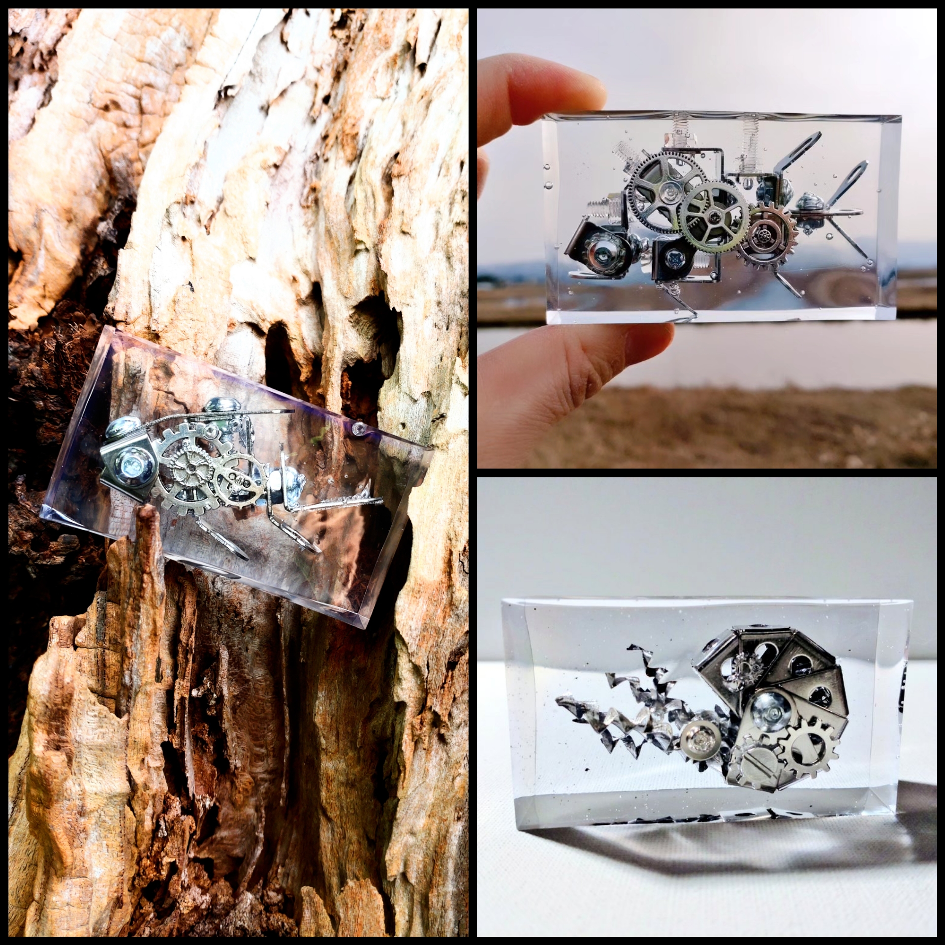 鉄パーツや廃鉄を利用しネジ止めしながら組み合わせて制作するメタルアートを制作しており、主に水生生物のモチーフを制作。