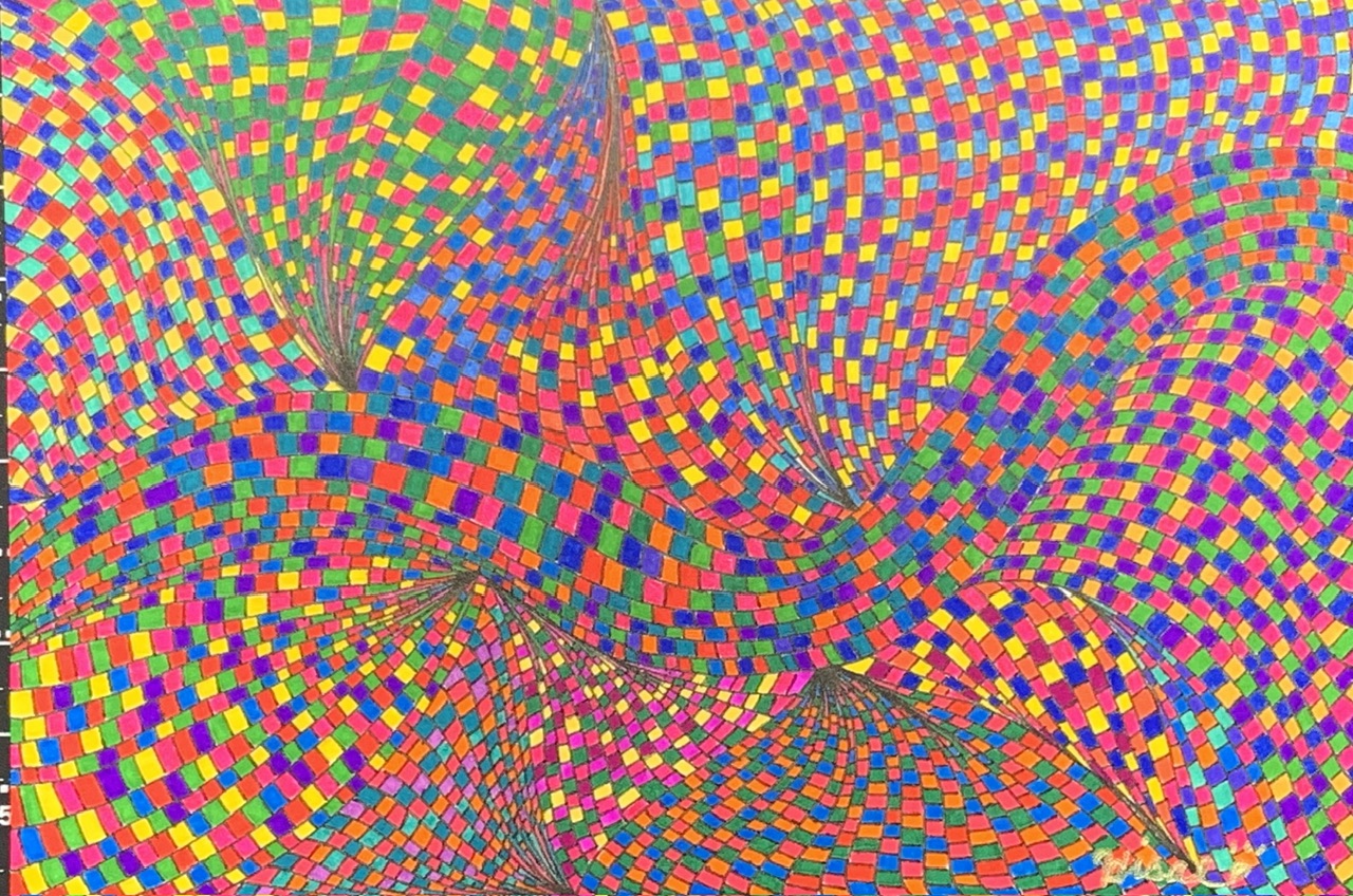 モザイクタイルの様に細かい四角で構成された絵がふと頭の中に浮かびました。頭の中にあるイメージを再現したアート。今までにない感じで、個人的に気に入ってます。