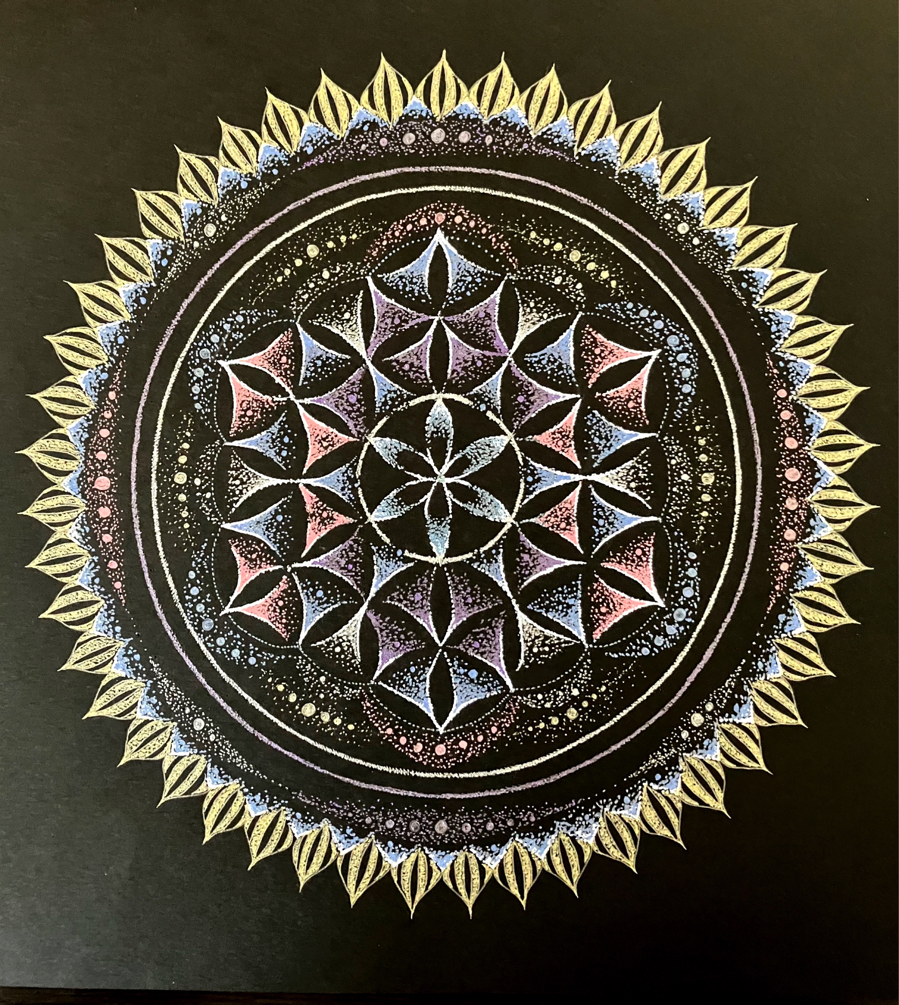点描曼荼羅を、【弁財天】さんイメージで描いてみた作品です。フラワーオブライフも取り入れてみました。曼荼羅は眺めているだけでも癒される感覚があります。そんな癒しのパワーを感じていただけたら嬉しいです。