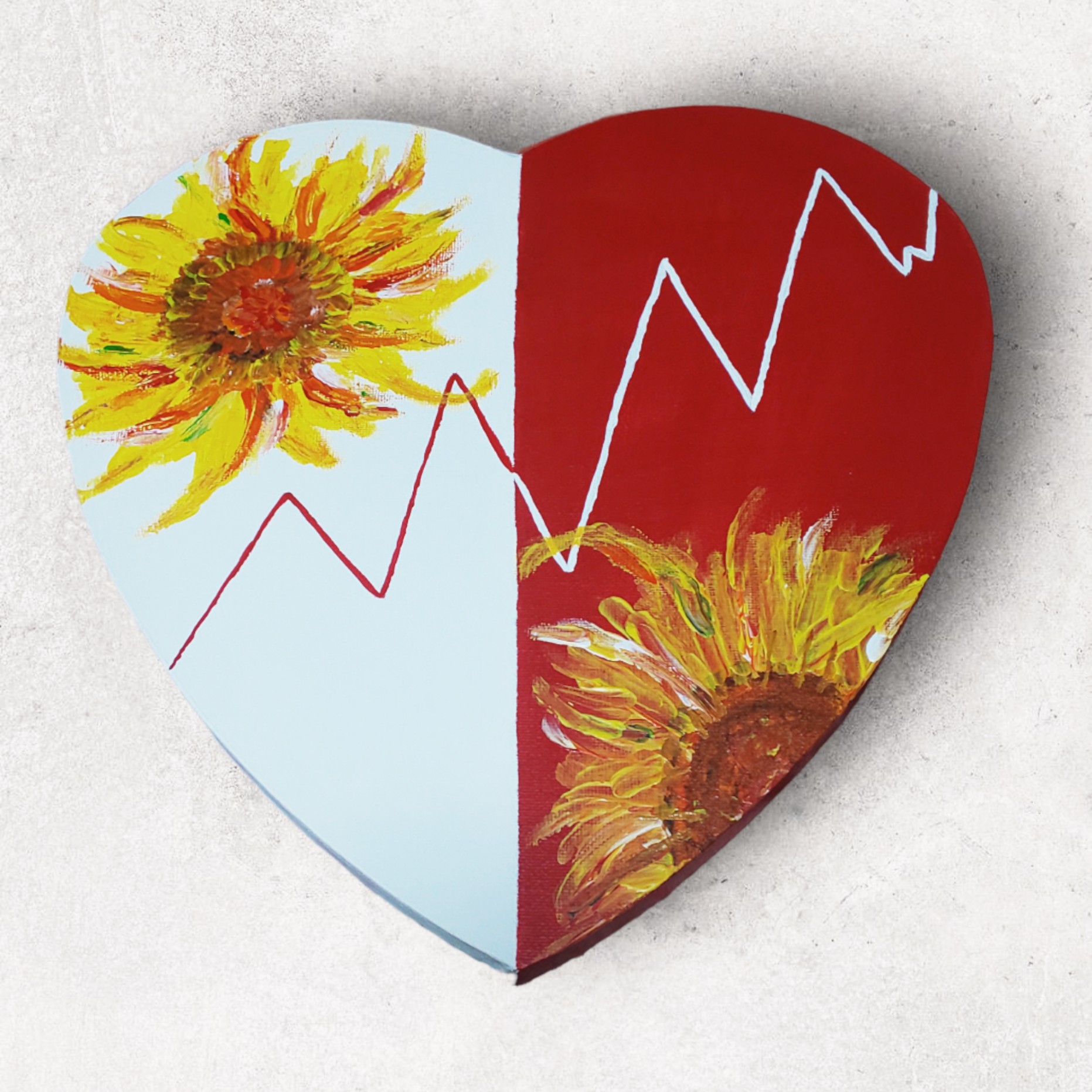 ハートのキャンバスで愛らしさと明るさ生き生きとした雰囲気、赤と白で華やかに縁起良く、エネルギッシュなイメージに。ジグザグ線は、生きる線として描いています。上下から見ても線はフラットで誰もが皆生きている、一緒だという意味と介護職を10年以上働く中で出逢った、出逢う色んな方々の想いや私自身感じて来たことを線に込め繋がりが生まれますようにと、気持ちの表現部分でもあります。ひまわりと太陽を組み合わせた絵を描き、元気が出て貰えたら嬉しいなぁという作品です。明日へ繫がる絵になれたら幸いです。