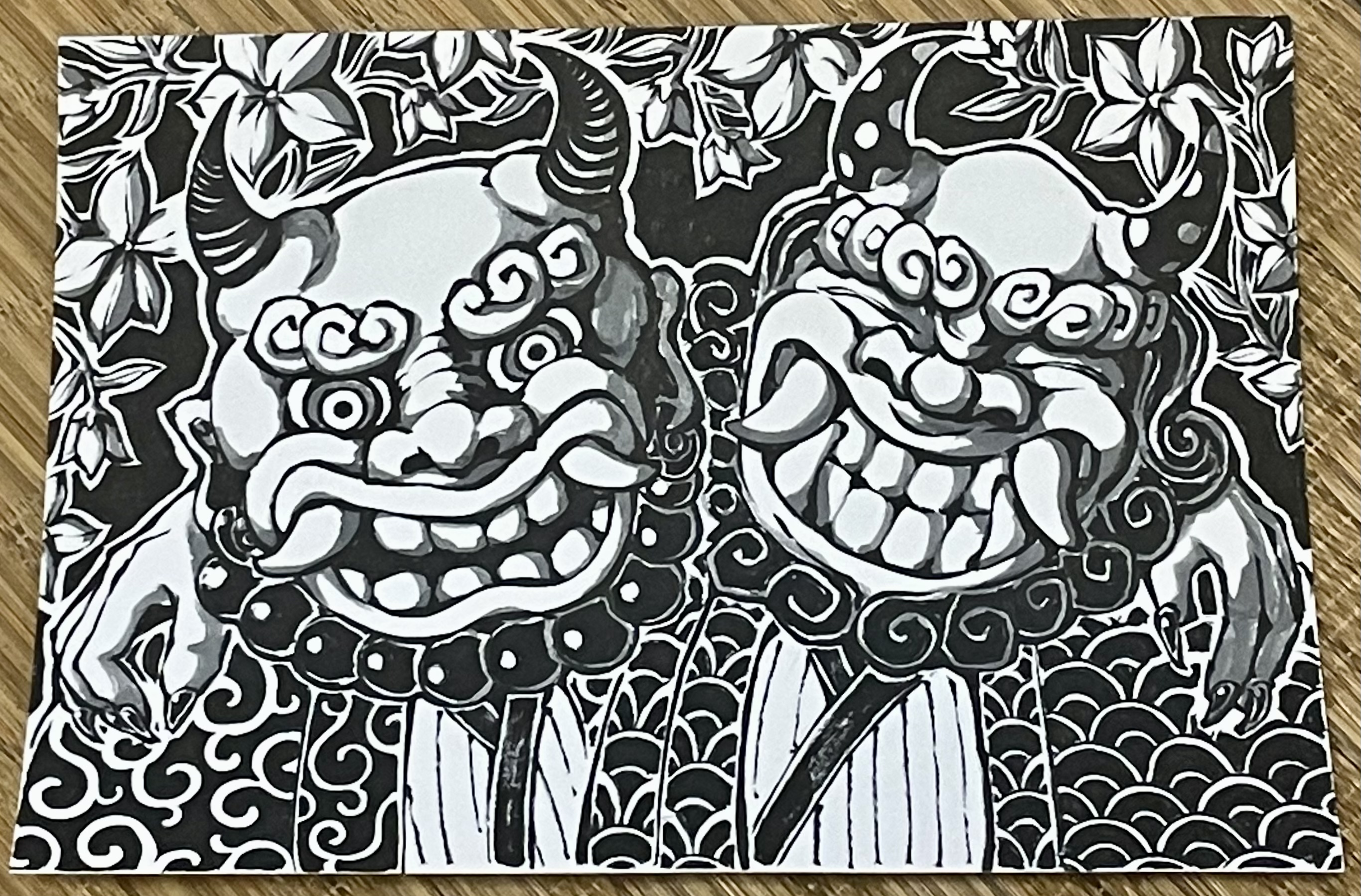 「笑い合い・絆」を鬼で表現した、筆ペン描きのイラストです背景の桔梗(ききょう)の花言葉は「友情」です。