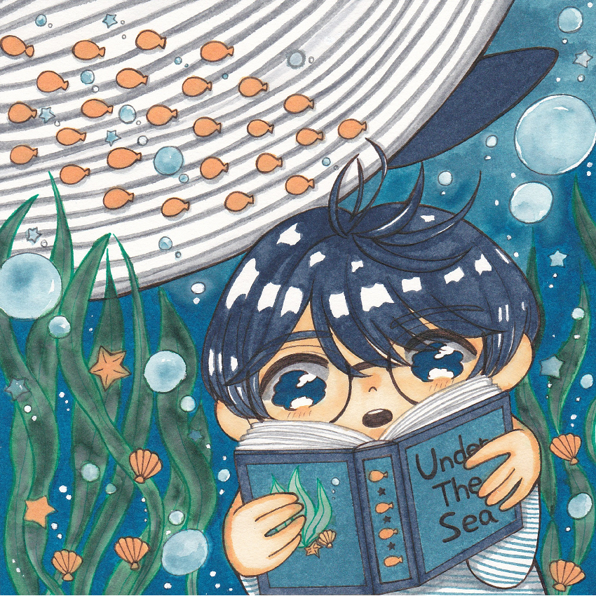 海の底にはなにがあるんだろう・・・。神秘的な海の世界に想いを馳せる少年と少年の頭に浮かぶ創造の海底を描きました。画材:ミリペン、ホワイト、呉竹クリーンカラーリアルブラッシュサイズ:正方形(縦横150㎜)