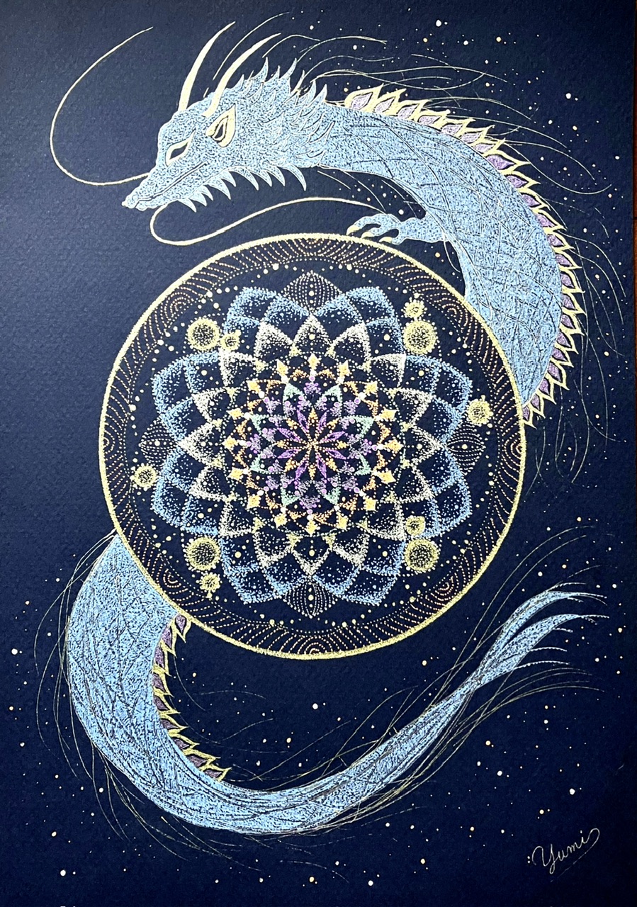 青龍さんのパワーを感じてそのイメージの曼荼羅を描いた作品です。ブルーが強くなりすぎないように優しいイメージで描きました。