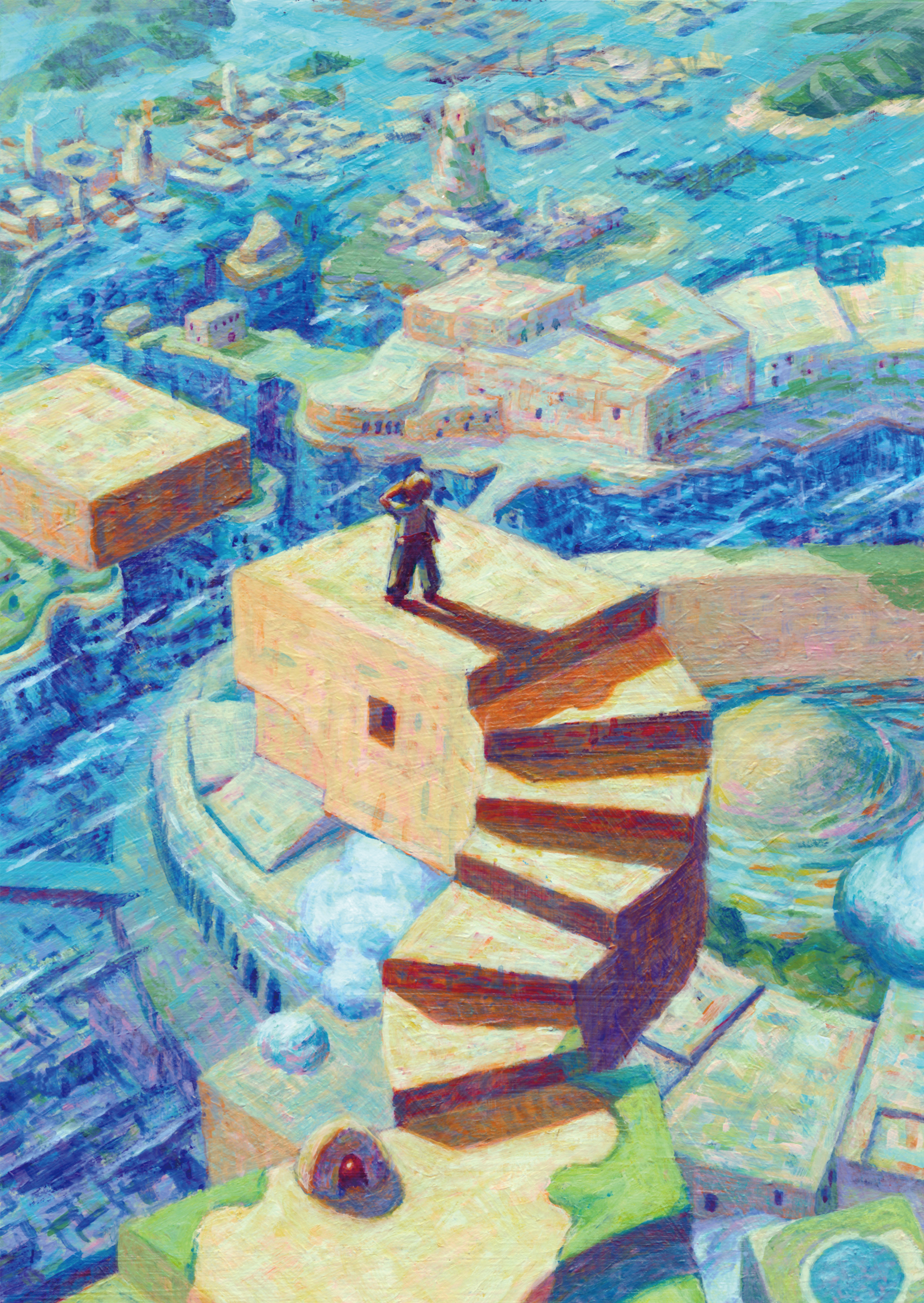 浮遊遺跡群を探索していると、眼下に半分水没した都市が見えてきました。