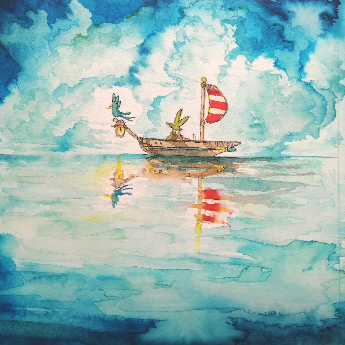 水面にうさぎの姿がないのには、理由があるはず。物語を読んで、途中でハッ!っとなって、また最初のページを振りかえってしまうような話はわりと好きです。ひとまず、彼らは「月」へ行くというおはなしの途中の青い景色。