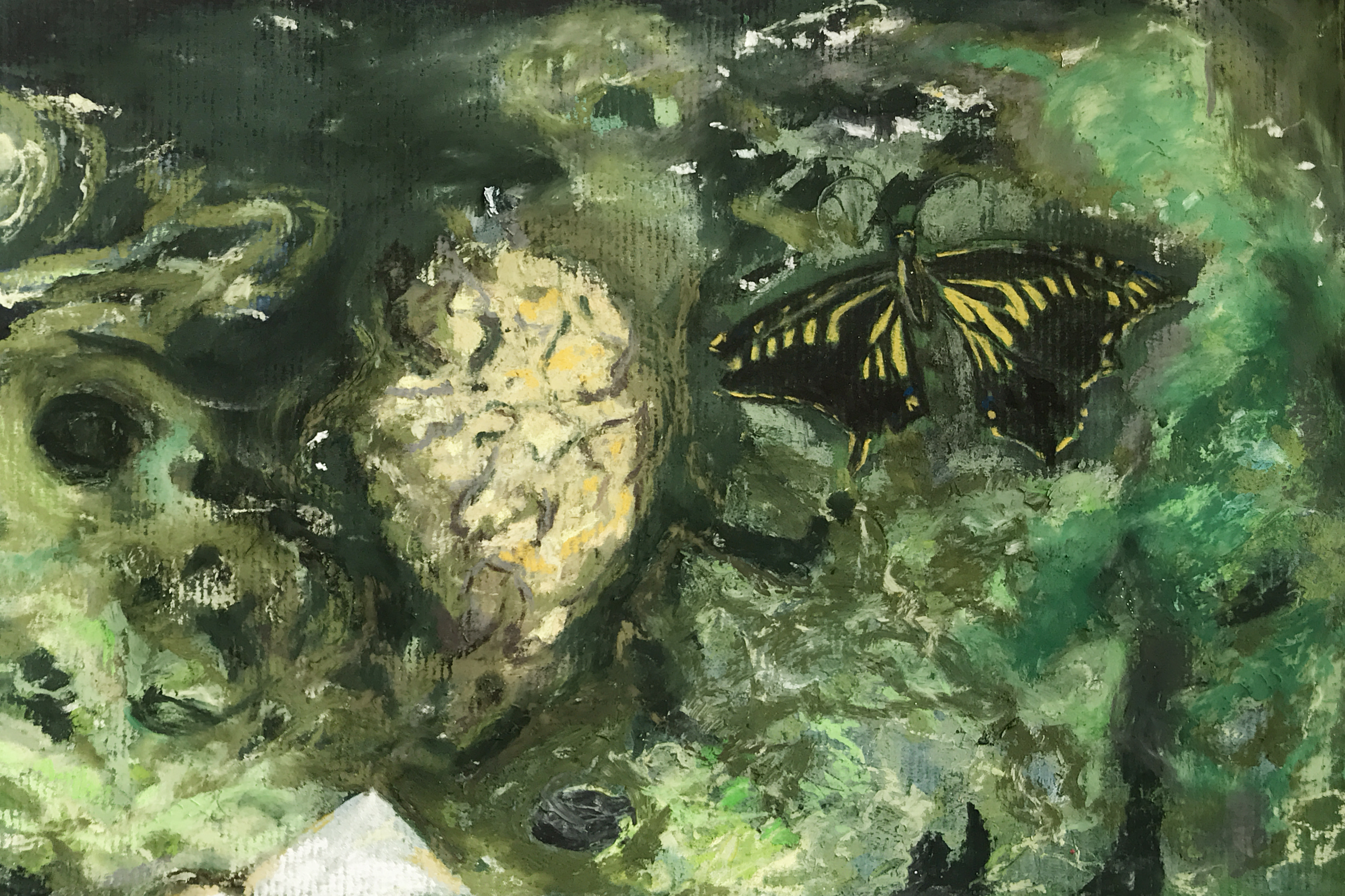 パステルと水彩絵の具で透明な水とそこに飛んできたアゲハチョウを描いてみました。