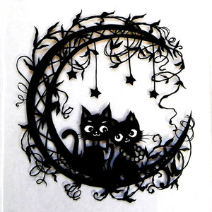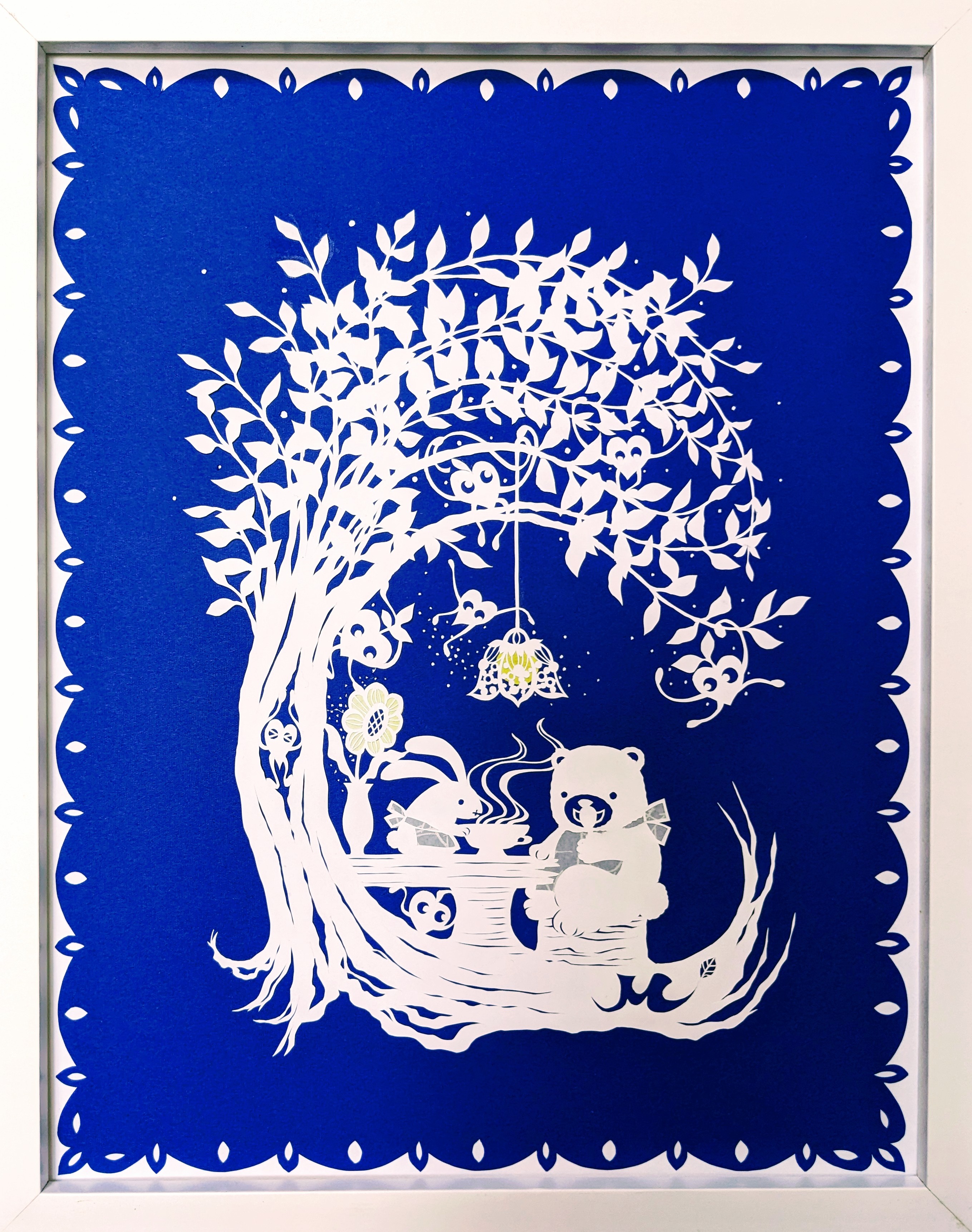 360度回転するデザインカッターナイフで柔らかな曲線を活かして切り抜いたオリジナル切り絵。長閑でほのぼのした楽しい食事風景を描いた作品です。