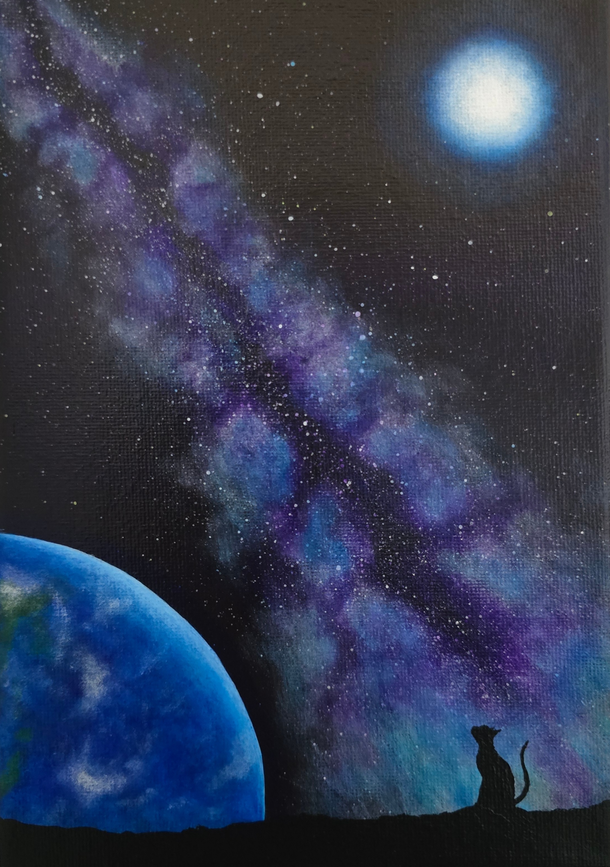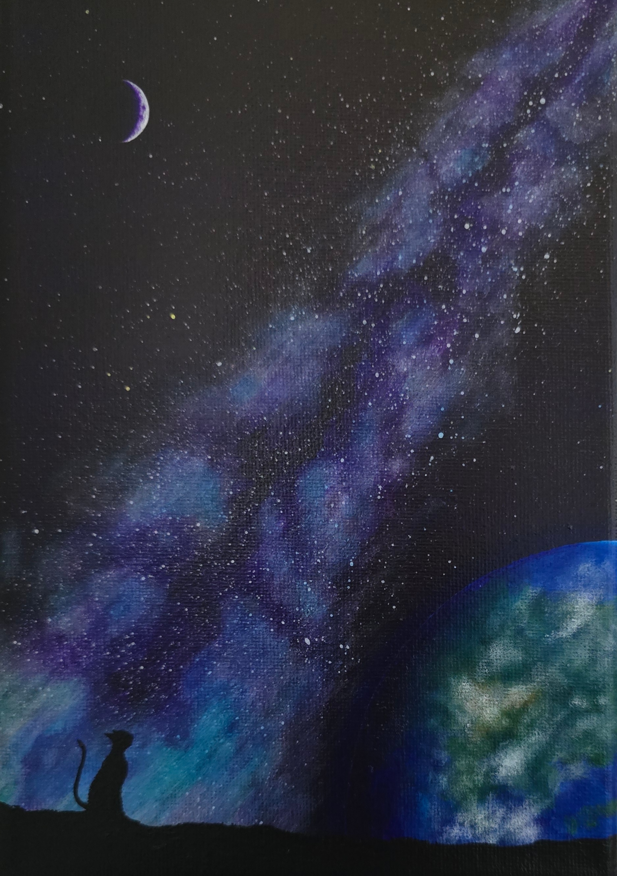 キャンバスにアクリル絵の具。smサイズ。黒いシルエットの宇宙猫は、宇宙が奏でるハーモニーに耳を澄ましています。もしかしたら、その宇宙猫は、地球に生まれてくるときに忘れてしまったぼくらの遠い記憶なのかもしれません。宇宙はハーモニーそのものだと思うのです。