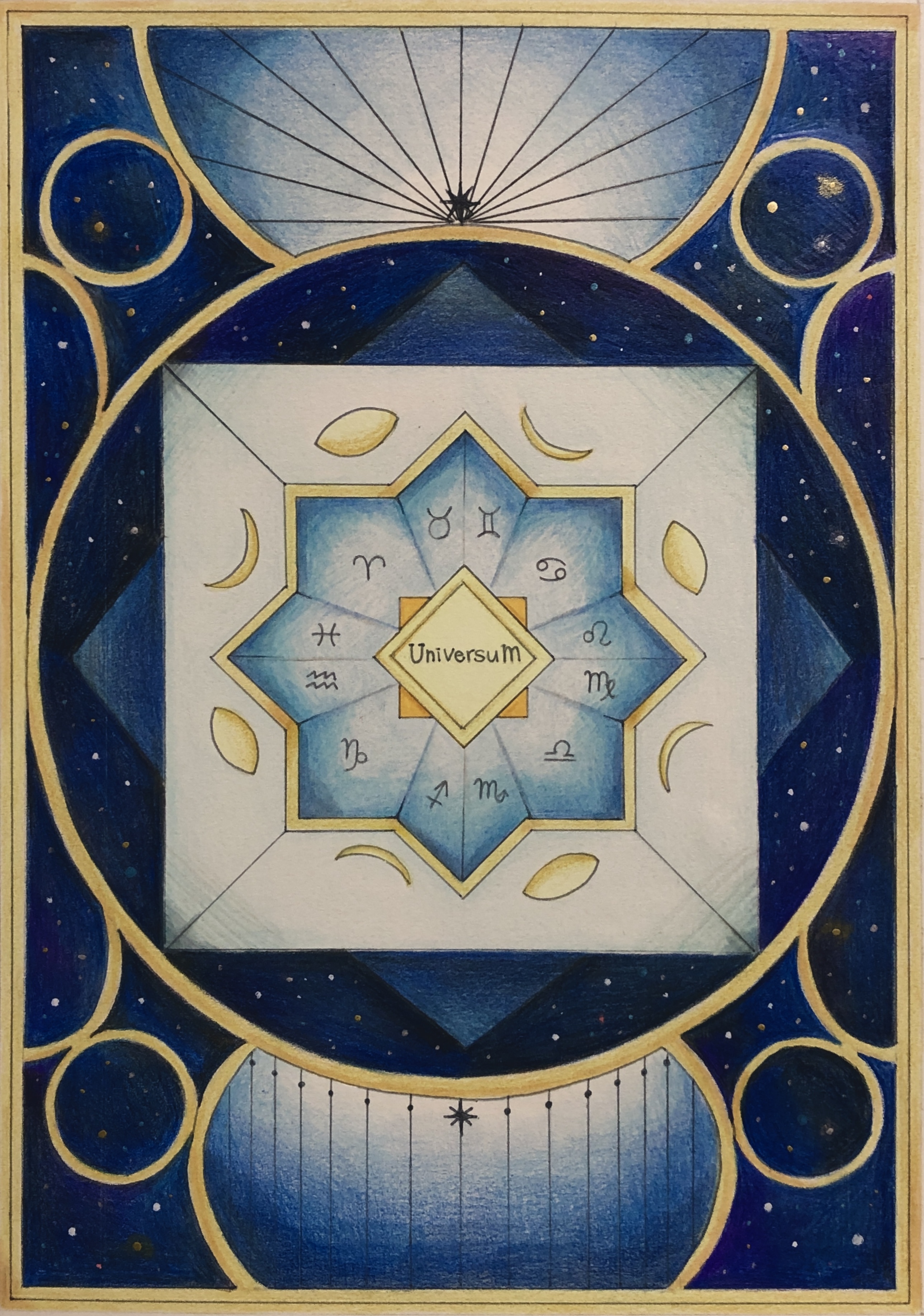 羅針盤をイメージし、デザイン調に制作しました。太陽線や色のグラデーションなどで宇宙の広がりを表現しています。