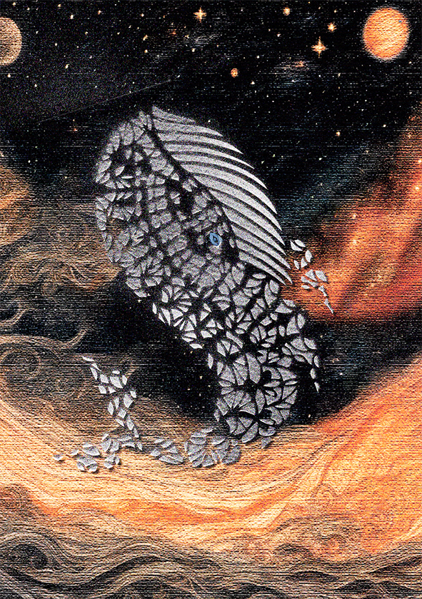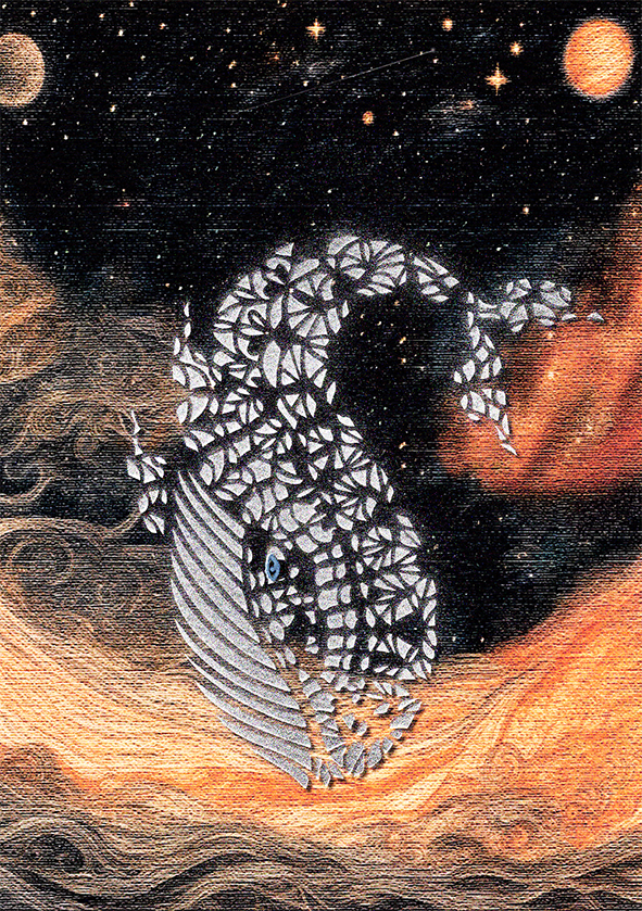 どこか遠い宇宙の星々や星雲に囲まれて、優雅に泳ぐクジラ。その目はどこか優しく、まるでその宇宙を知り尽くしてるかのよう。