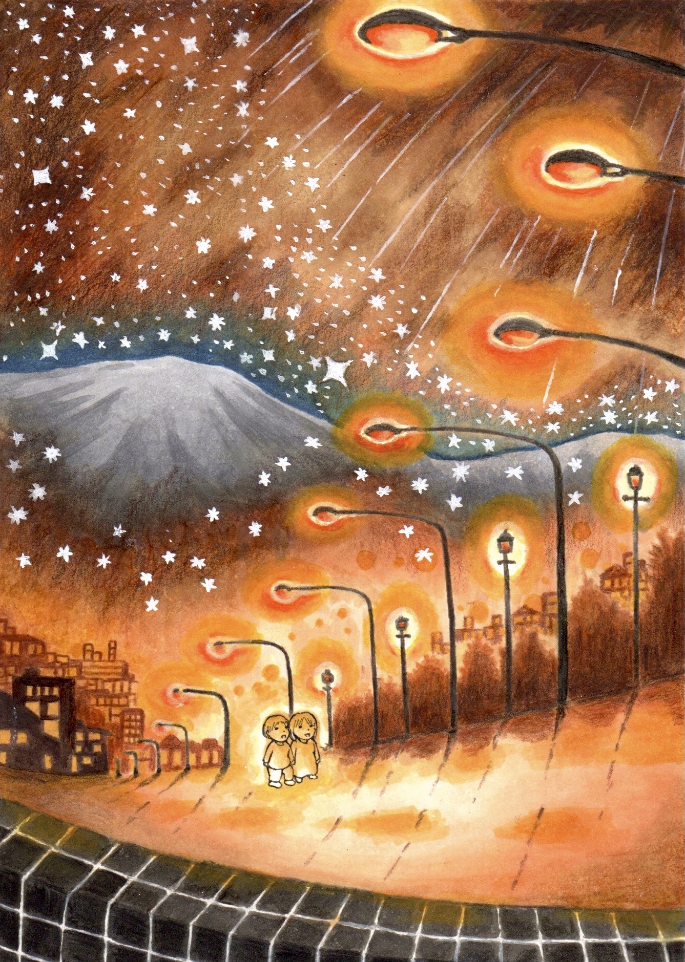 空気が澄んだ寒い季節に、暖かくオレンジに光る街灯を見るとなんだか懐かしい気持ちとソワソワ、ワクワクする高揚感を感じます。そんな自分が見ている世界を描きました。