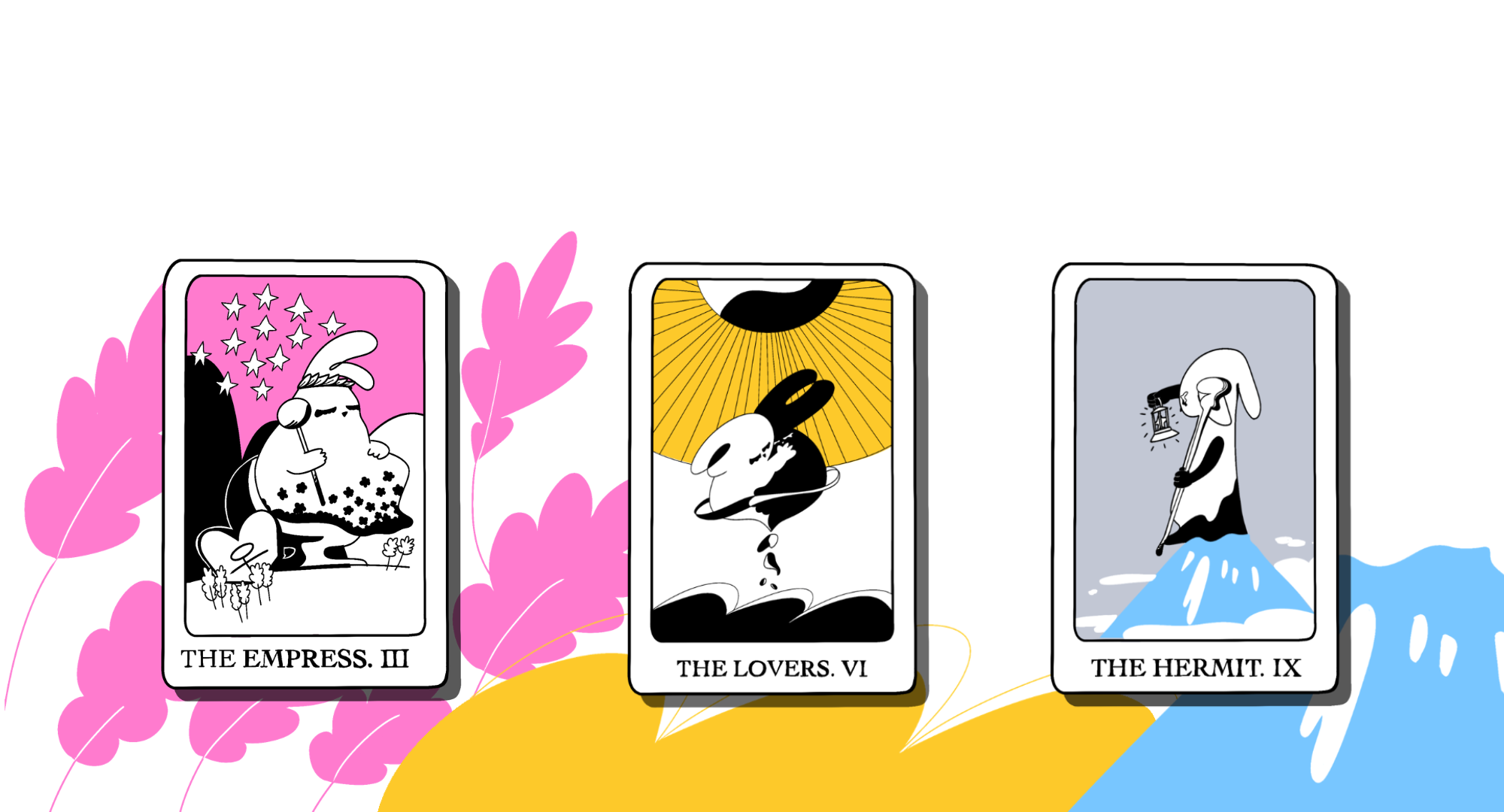 かわいい モノトーン 幻想的 シュールタロットカードの「女帝」「恋人」「隠者」をそれぞれオリジナルキャラクターで描きました。世界に生まれて陰陽の統合ののち真理を悟るというよなイメージです。