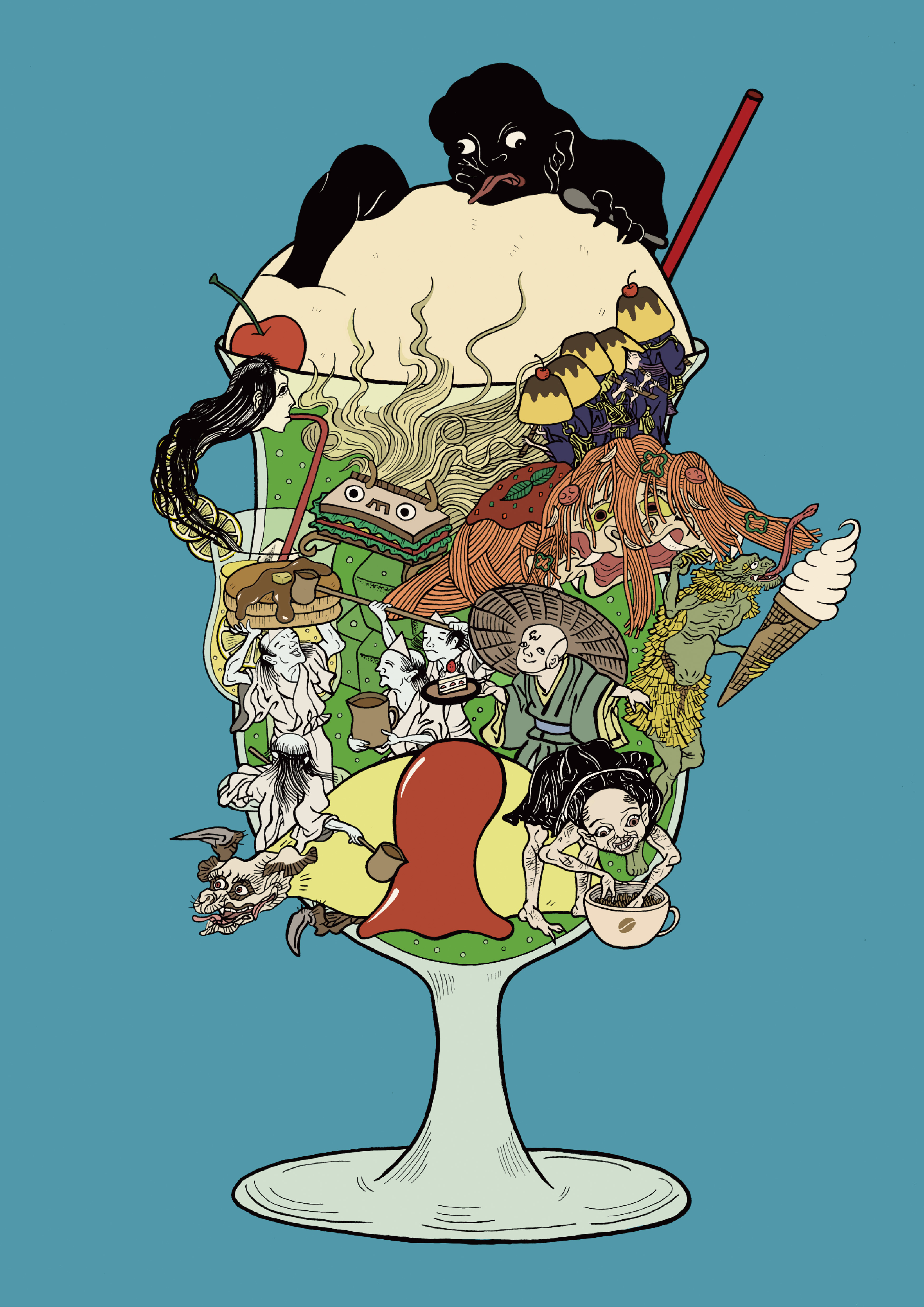 レトロ喫茶をイメージしてクリームソーダに妖怪を詰め込みました。[使用した妖怪]小豆洗い×コーヒー大入道×クリームソーダおとろし×ナポリタン琴古主×サンドイッチ皿屋敷×レモンスカッシュ猪口暮露×プリン天井嘗×ソフトクリーム豆腐小僧×ケーキ船幽霊×ホットケーキわいら×オムライス