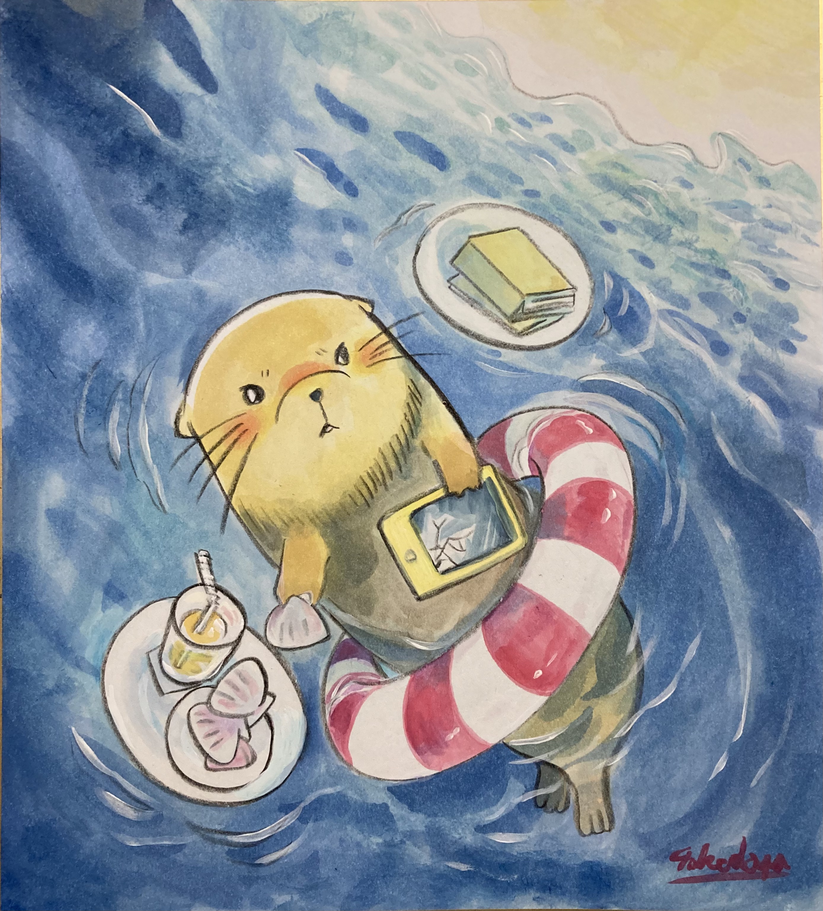 かわいい ふんわり カラフル キャラ不透明水彩で描いた擬人化ディフォルメのラッコです。