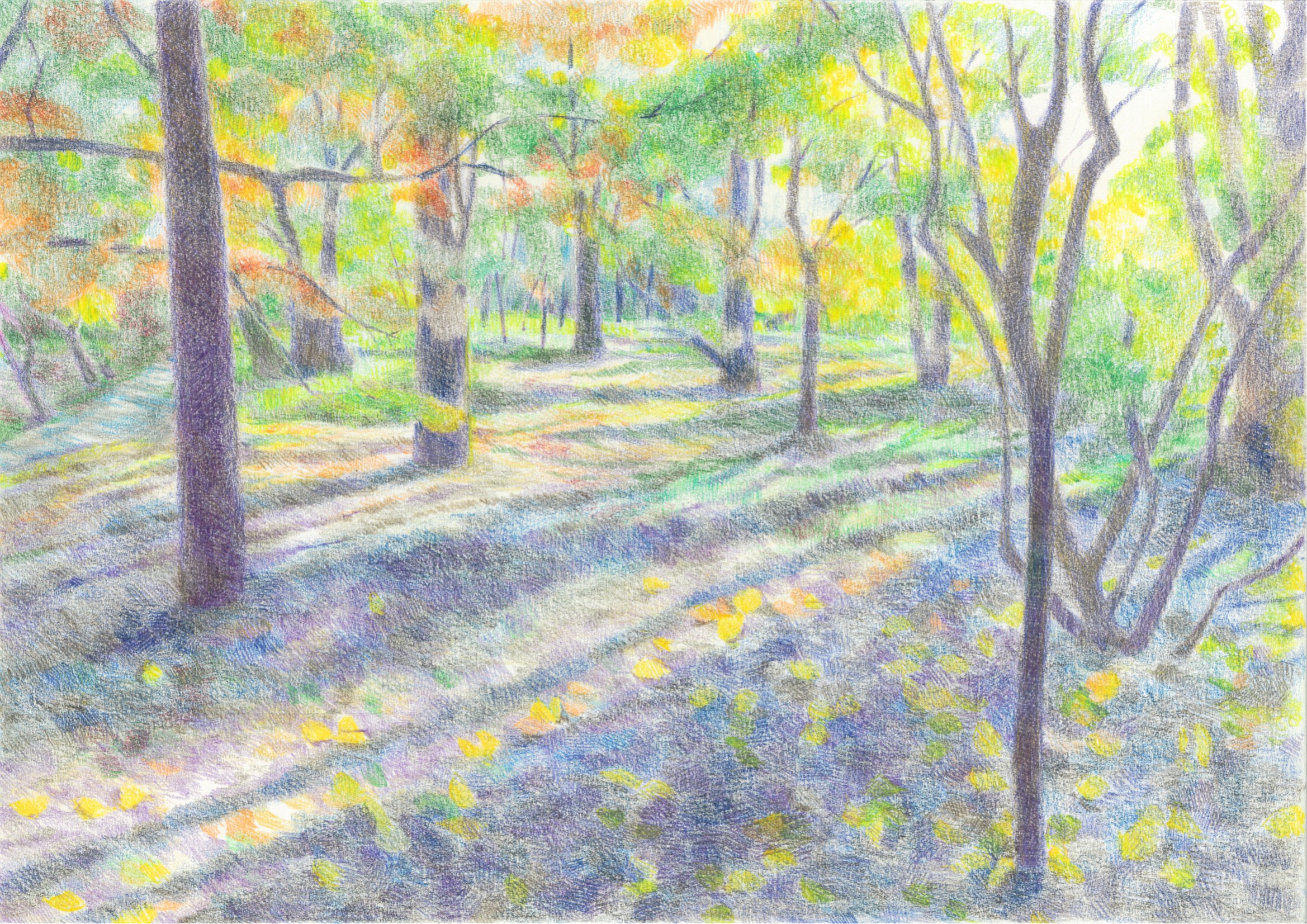 かわいい ふんわり 幻想的 きれい地面に伸びる長い影と、木々の直線が重なり、複雑で面白い情景。