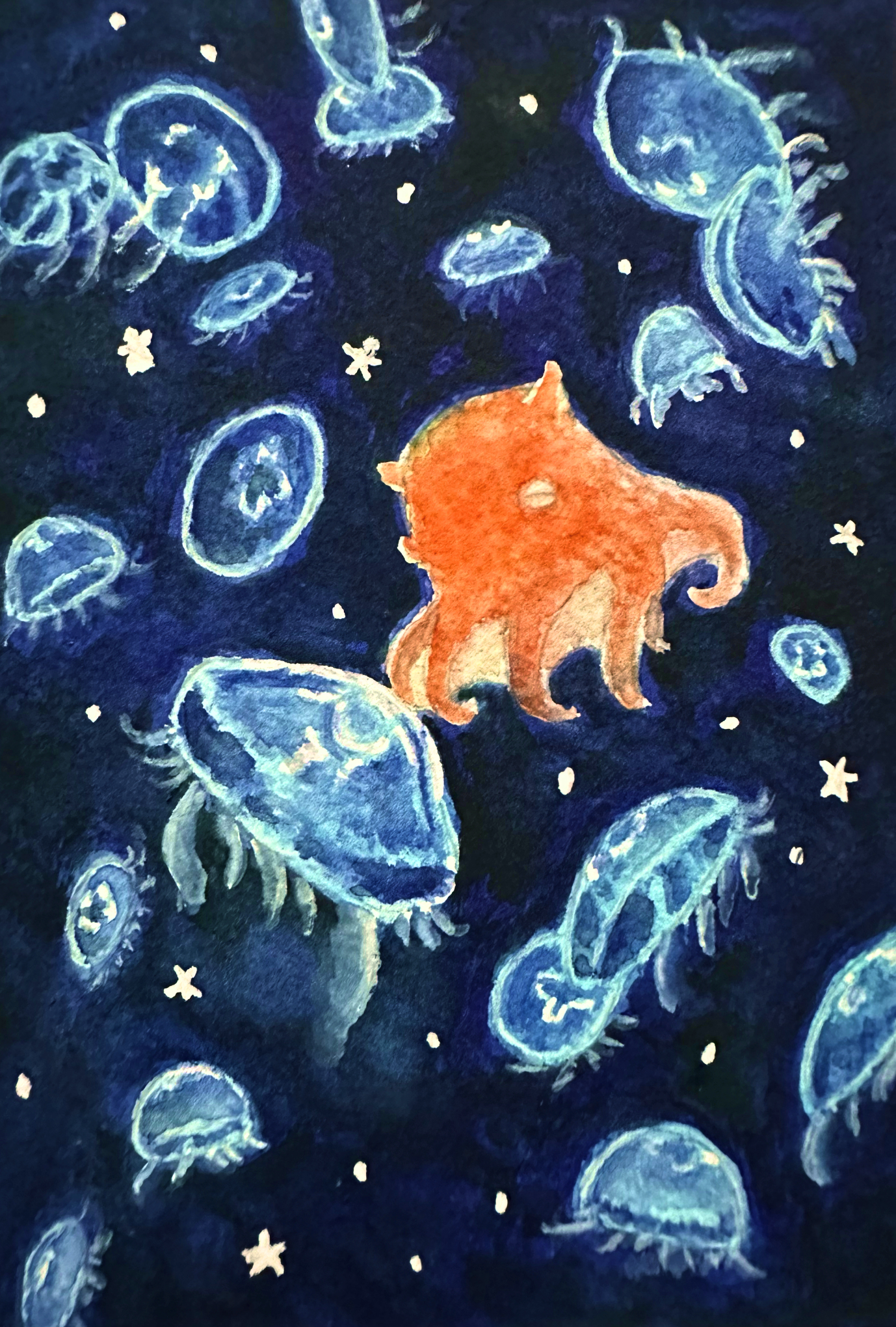 かわいい 幻想的好きな海の生物であるメンダコとクラゲを描きました。